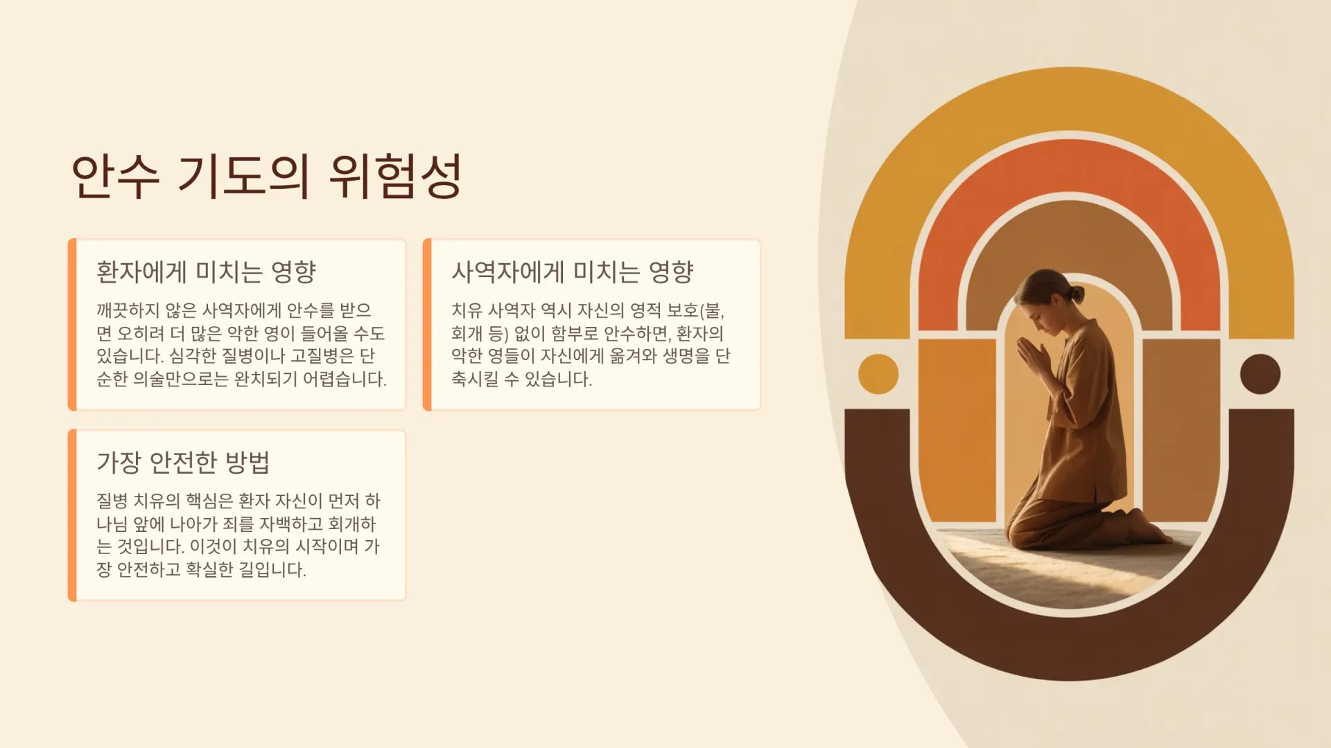 그러나 많은 사람들이 자신의 죄를 회개하지 않고 무조건 고쳐 달라고 하나님에게 떼를 쓰며 기도하거나, 능력 있는 사역자를 찾아가 안수만 받으려고 한다. 그러나 이는 하나님을 만홀히 여기는 것이며, 치유의 근본 원리를 무시하는 것이다. 하나님께서는 우리가 질병을 통해 자신의 죄를 깨닫고, 하나님을 모르고 살았던 과거를 청산하며, 하나님께로 돌아오기를 원하시기 때문이다. 따라서 병이 들었을 때 우리는 가장 먼저 무릎 꿇고, “하나님, 제가 잘못했습니다. 하나님을 모르고 우상을 숭배하며 내 뜻대로 살았습니다”**라고 진실하게 자백해야 한다. 이것이 치유의 첫걸음이다.