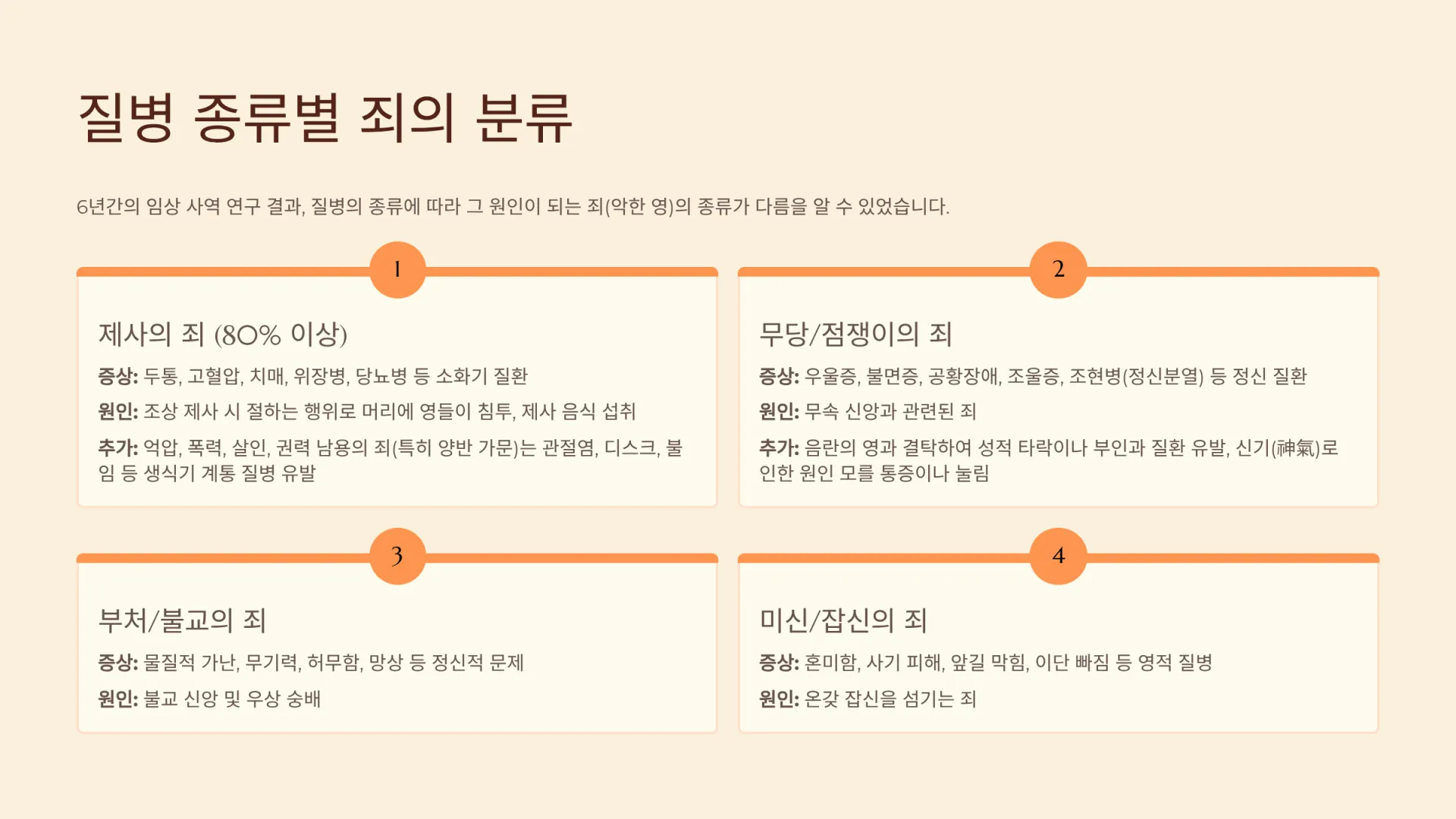 필자가 지난 6년간 임상 사역을 통해 연구한 바에 따르면, 질병의 종류에 따라 그 원인이 되는 죄(악한 영)의 종류가 다름을 알 수 있었다. 크게 네 가지 우상숭배의 죄들 가운데 특히 조상제사의 죄와 억압 폭력 권력남용의 죄가 질병과 관련이 깊었다.