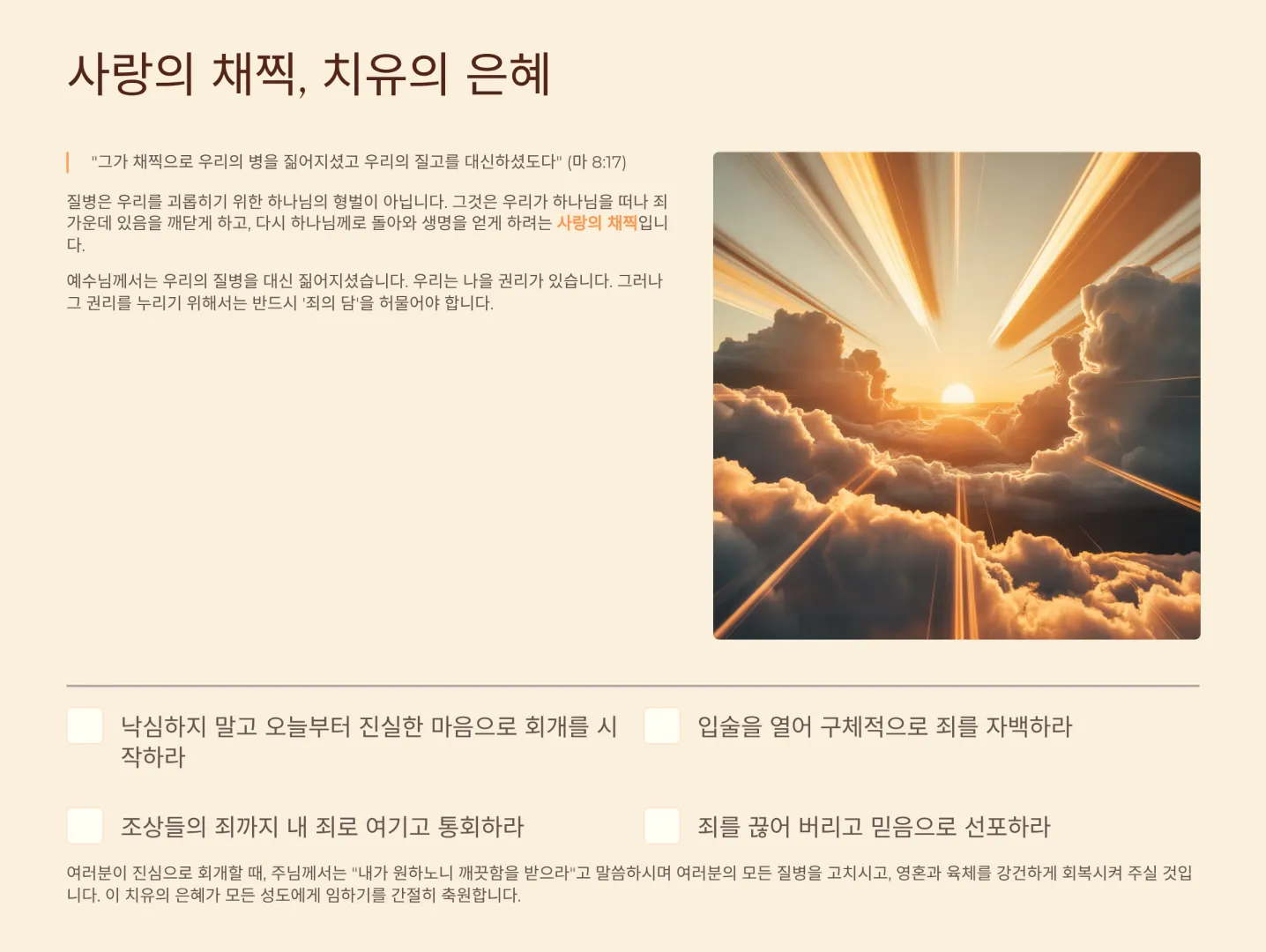 질병은 우리를 괴롭히기 위한 하나님의 형벌이 아니다. 그것은 우리가 하나님을 떠나 죄 가운데 있음을 깨닫게 하고, 다시 하나님께로 돌아와 생명을 얻게 하려는 사랑의 채찍이다.