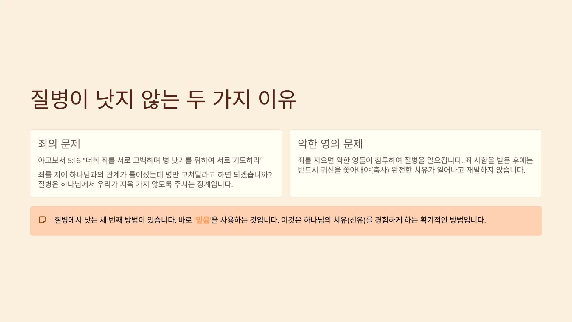 그러나 우리가 겪는 심각한 질병, 불치병, 난치병, 그리고 대대로 내려오는 유전병 등은 대부분 죄와 악한 영의 문제와 결부되어 있다. 따라서 질병이 왔을 때, 먼저는 내 삶을 돌아보고 죄를 회개해야 하며(영적 원인 제거), 동시에 의학적인 도움이나 건강 관리도 병행해야 한다(육적 원인 제거). 그리고 무엇보다 하나님의 믿음을 사용하여 치유를 선포해야 한다.
