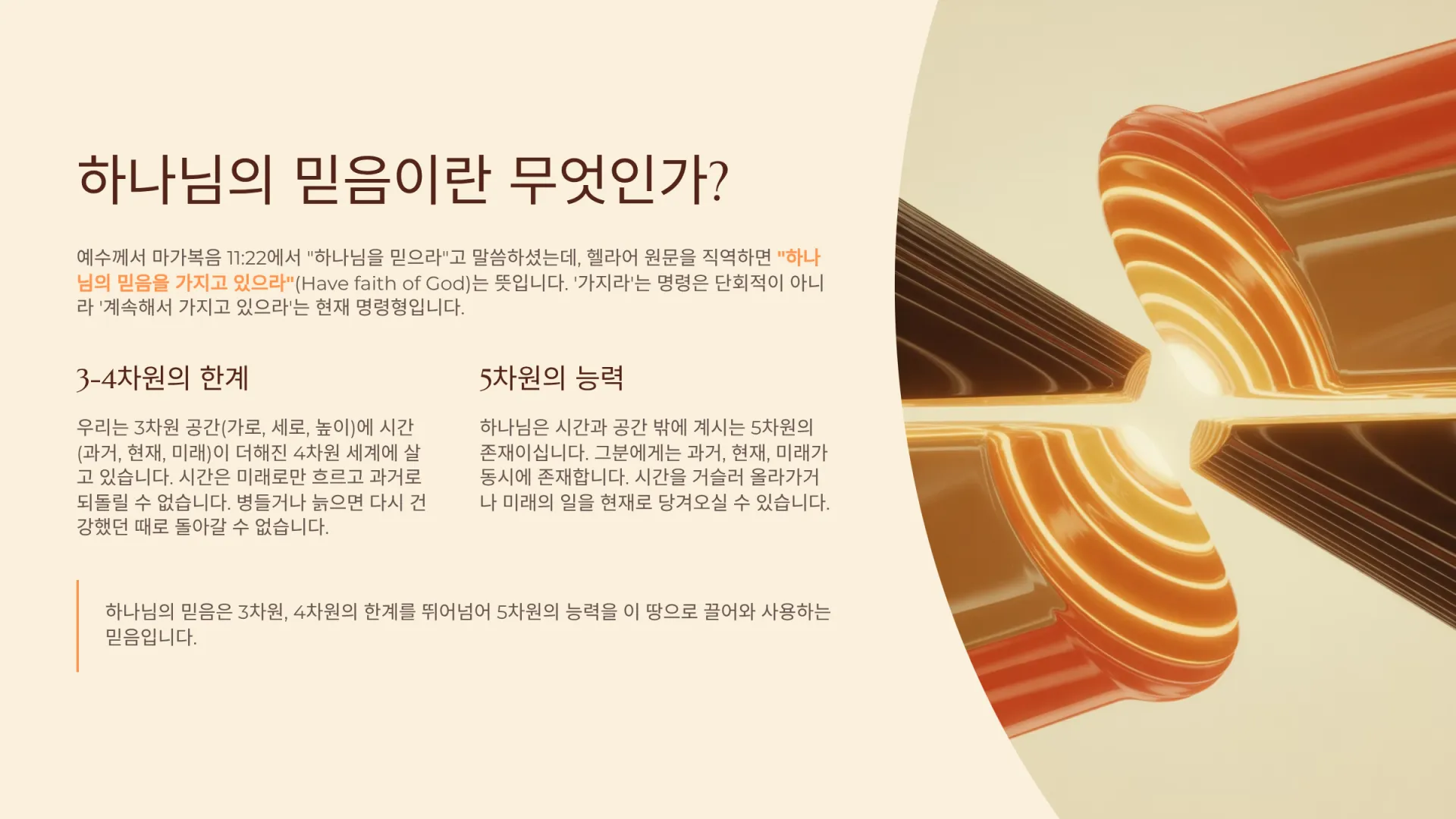 그렇다면 ‘하나님의 믿음’이란 무엇인가? 그것은 3차원, 4차원의 한계를 뛰어넘어 5차원의 능력을 이 땅으로 끌어와 사용하는 믿음이다. 우리는 3차원 공간(가로, 세로, 높이)에 시간(과거, 현재, 미래)이 더해진 4차원의 세계에 살고 있다. 이 세계에서는 시간은 미래로만 흐르고, 과거로 되돌릴 수 없으며, 이미 엎지른 물을 다시 담을 수 없는 한계가 있다. 병이 들거나 늙어서 쇠약해지면 다시 젊어지거나 건강했던 때로 돌아갈 수 없다.