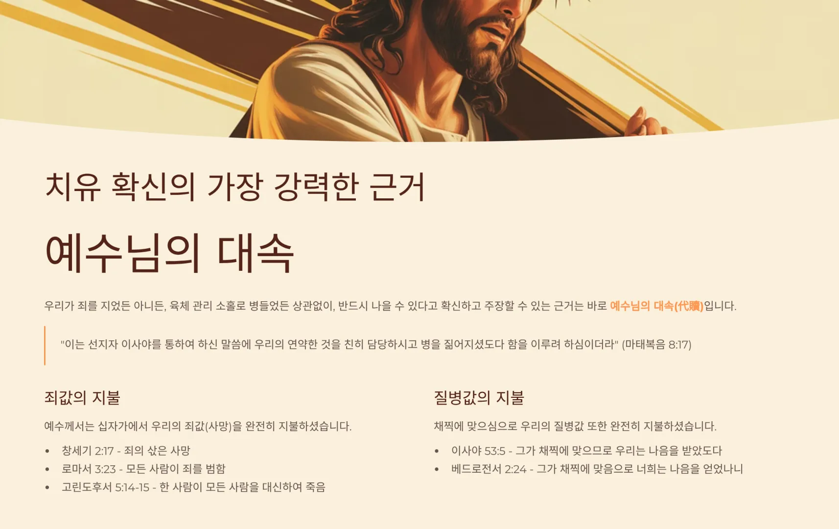 우리가 죄를 지었든 아니든, 혹은 육체 관리 소홀로 병들었든 상관없이, 우리가 반드시 나을 수 있다고 확신하고 주장할 수 있는 근거는 무엇인가? 그것은 바로 예수님의 대속(代贖)이다.