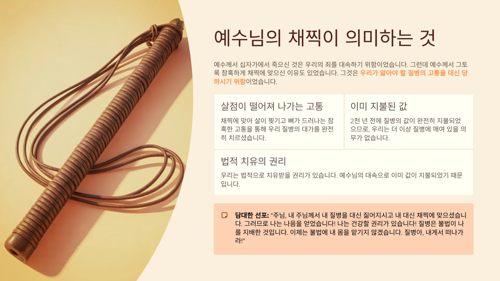 예수께서 십자가에서 죽으신 것은 우리의 죄를 대속하기 위함이었다. 그런데 예수께서 그토록 참혹하게 채찍에 맞으신 이유도 있었다. 그것은 우리가 앓아야 할 질병의 고통을 대신 당하시기 위함이었다. 살점이 떨어져 나가고 뼈가 드러나는 고통을 통해, 그분은 우리 질병의 대가를 이미 다 치르셨다(Pay off). 우리는 예수님의 십자가 죽음 이후를 살아가고 있는 성도들이다. 이미 2천 년 전에 질병의 값이 지불되었으므로, 우리는 더 이상 질병에 매여 있을 의무가 없다. 우리는 법적으로 치유받을 권리가 있는 것이다.