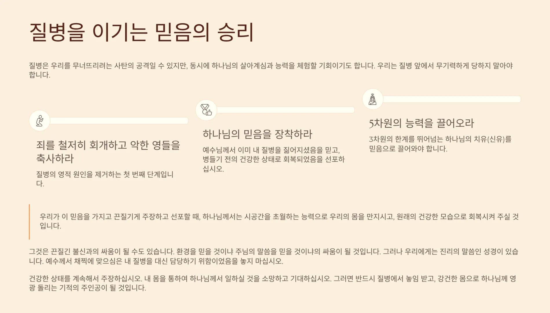 질병은 우리를 무너뜨리려는 사탄의 공격일 수 있지만, 동시에 하나님의 살아계심과 능력을 체험할 기회이기도 하다. 우리는 질병 앞에서 무기력하게 당하지 말아야 한다. 첫째, 질병의 원인이 된 죄를 철저히 회개하고, 악한 영들을 축사하면 된다. 그리고 둘째, ‘하나님의 믿음’을 장착하라. 예수님께서 이미 내 질병을 짊어지셨음을 믿고, 병들기 전의 건강한 상태로 회복되었음을 선포하라. 그리고 3차원의 한계를 뛰어넘는 5차원의 능력, 즉 하나님의 치유(신유)를 믿음으로 끌어와야 한다.