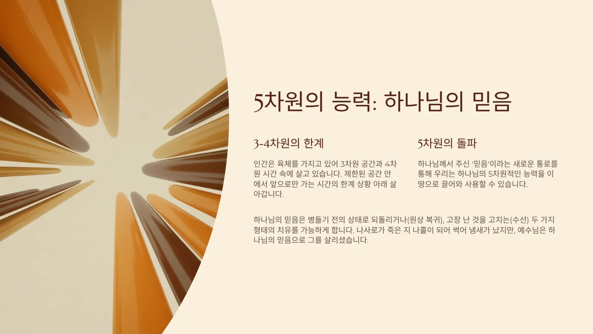 그렇다. 인간은 육체를 가지고 있어서, 3차원 공간과 4차원 시간 속에 살고 있기에 어떤 제한 공간 안에 앞으로만 가는 시간의 한계 상황 아래에서 살고 있다. 그러나 우리 성도들에게는 하나님께서 주신 ‘믿음’이라는 새로운 통로가 있다. 이 믿음을 통해 우리는 하나님의 5차원적인 능력을 이 땅으로 끌어와 사용할 수 있다. 그러므로 만약 누구든지 이러한 5차원적인 놀라운 믿음을 사용할 수 있기만 한다면, 그는 모든 질병과 문제들을 뛰어넘고 승리하는 역전의 용사들이 될 수 있을 것이다.