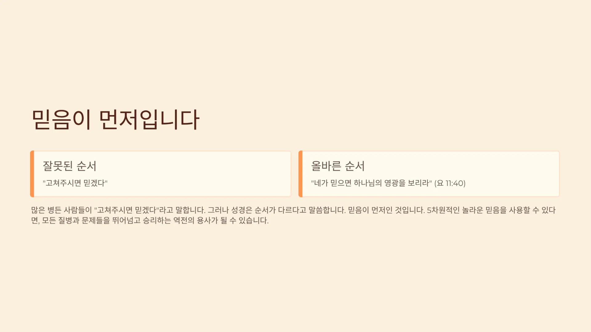 병든 사람들 중에는 많은 사람들이 하같이 “고쳐주시면 믿겠다”라고 말을 한다. 그러나 성경은 “네가 믿으면 하나님의 영광을 보리라”(요 11:40)고 말씀하고 있다. 순서가 중요하다. 믿음이 먼저인 것이다. 나사로가 죽은 지 나흘이 되어 이미 썩어 냄새가 나고 있었지만, 예수께서는 하나님의 믿음으로 그를 살리셨다. 썩은 것을 고친(수선ㅎ나) 것이 아니라, 썩기 이전의 상태로 되돌려놓으신 것이다. 이것이 바로 5차원의 능력 곧 하나님의 신유를 사용한 것이다.
