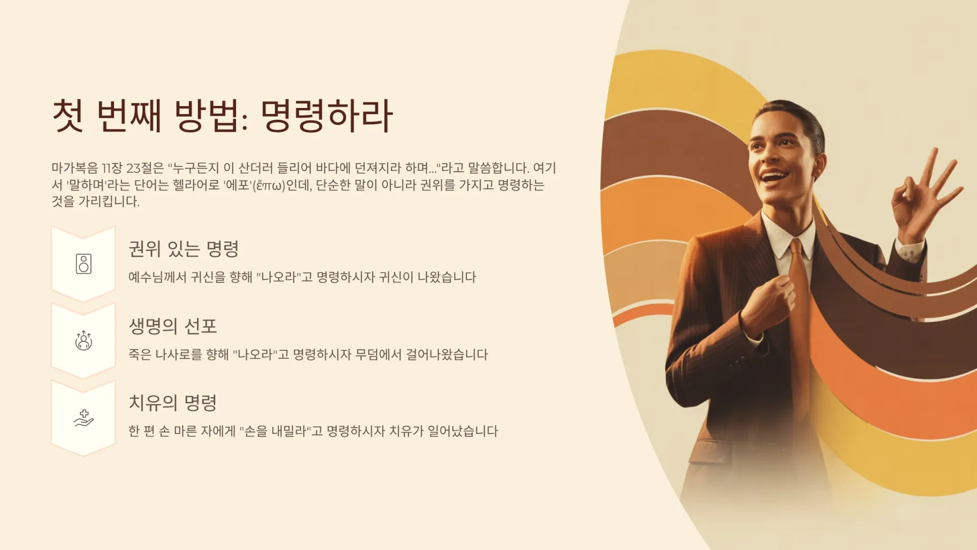 마가복음 11장 23절은 믿음의 사용법에 대한 매우 중요한 단서를 하나 제공한다. 그것은 바로 “누구든지 이 산더러 들리어 바다에 던져지라 하며…”라는 말 속에 답이 들어 있다. 그것은 첫 번째 방법으로서, ‘명령하는 것’(말하는 것)이다. 여기서 ‘말하며’라는 단어는 헬라어로 ‘에포’(ἔπω)인데, 단순한 말이 아니라 권위를 가지고 명령하는 것을 가리킨다.