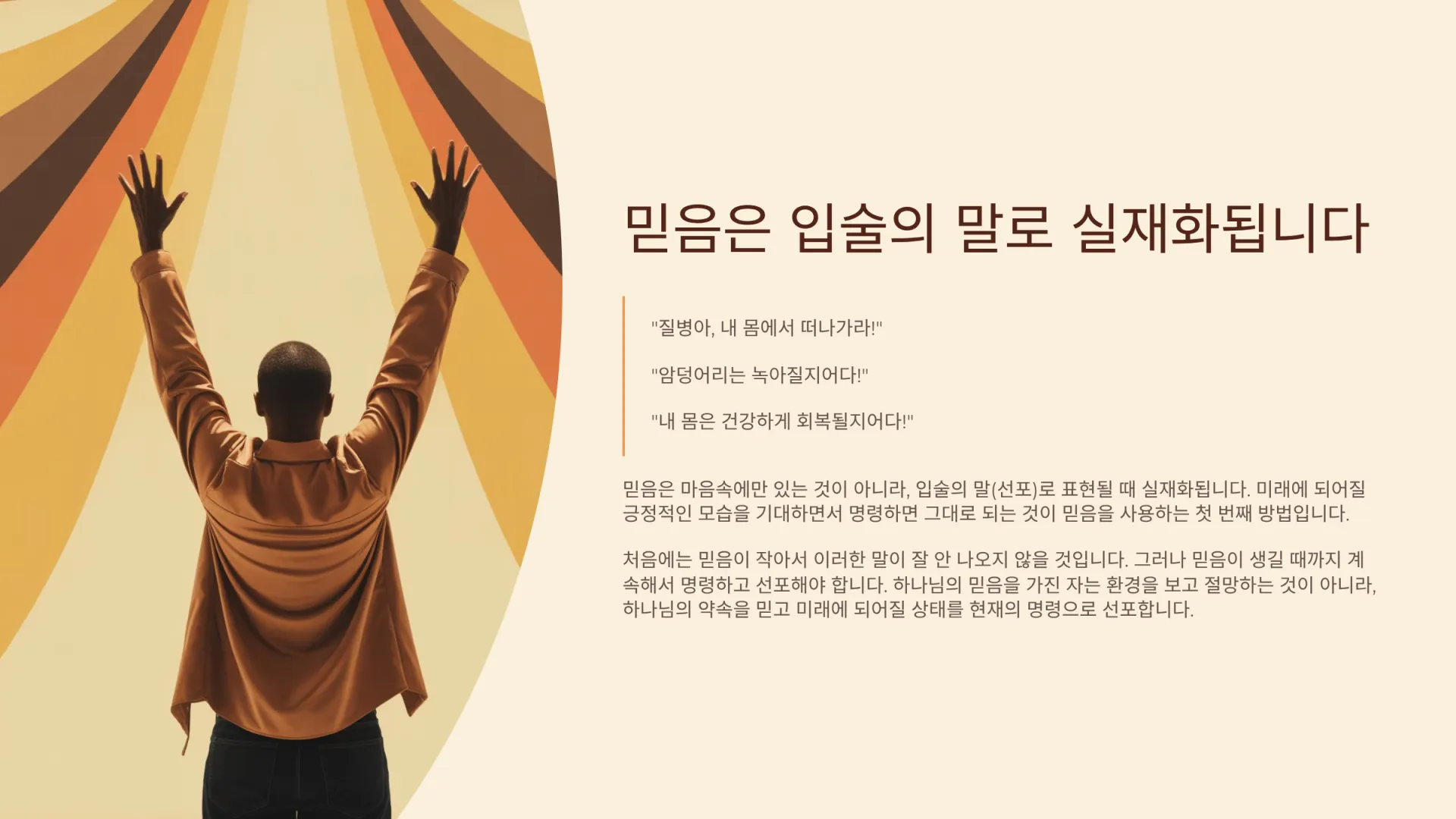 그렇다. 믿음은 마음속에만 있는 것이 아니라, 입술의 말(선포)로 표현될 때 실재화된다. 미래에 되어질 긍정적인 모습을 기대하면서 “질병아, 내 몸에서 떠나가라!”, “암덩어리는 녹아질지어다!”, “내 몸은 건강하게 회복될지어다!”라고 명령하면 그대로 되는 것이 믿음을 사용하는 첫 번째 방법이다. 처음에는 자기 자신이 믿음이 작은 까닭에 이러한 말이 잘 안 나오지 않을 것이다. 그러나 믿음이 생길 때까지 계속해서 명령하고 선포해야 한다. 필자 역시 허리 디스크로 누워 있을 때, 한 번도 ‘나는 이 병으로 죽을 것이다’라고 생각하지 않았다. “반드시 고쳐질 것이다. 하나님이 나를 쓰실 것이다”라고 계속해서 선포하고 주장했다.