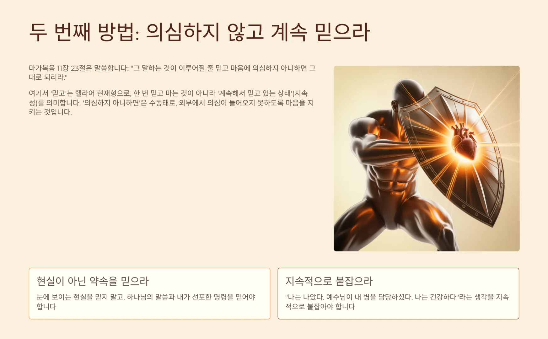 23절 중반부에는 하나님의 믿음을 사용하는 두 번째 방법을 제시한다. “…그 말하는 것이 이루어질 줄 믿고 마음에 의심하지 아니하면 그대로 되리라.” 그렇다. 하나님의 믿음을 사용하는 두 번째 방법은 ‘마음에 의심하지 않고 계속 믿는 것’이다. 여기서 ‘믿고’는 헬라어 현재형으로, 한 번 믿고 마는 것이 아니라, ‘계속해서 믿고 있는 상태’(지속성)를 의미한다. 또한 ‘의심하지 아니하면’ 역시 수동태로, ‘의심되게 하지 않는다’는 뜻이다. 즉, 외부에서 의심이 들어오지 못하도록 마음을 지키는 것이다.