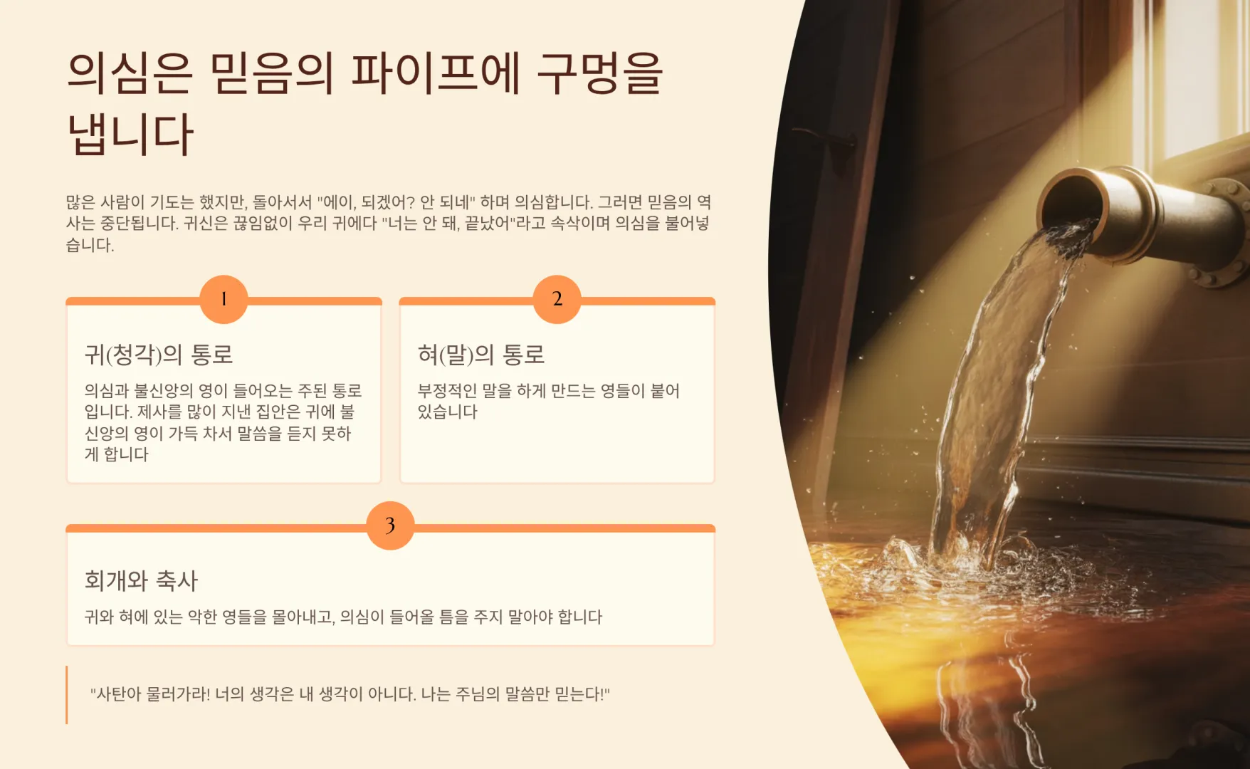 많은 사람이 기도는 했지만, 돌아서서 “에이, 되겠어? 안 되네” 하며 의심한다. 그러면 믿음의 역사는 중단된다. 의심은 믿음의 파이프에 구멍을 내는 것과 같다. 귀신은 끊임없이 우리 귀에다 “너는 안 돼, 끝났어”라고 속삭이며 의심을 불어넣는다. 특히 귀(청각)는 의심과 불신앙의 영이 들어오는 주된 통로이다. 제사를 많이 지낸 집안은 귀에 불신앙의 영이 가득 차서 말씀을 듣지 못하게 하고 의심하게 만든다. 또 혀(말)에는 부정적인 말을 하게 만드는 영들이 붙어 있다. 그러므로 우리는 회개를 통해 귀와 혀에 있는 악한 영들을 몰아내고, 의심이 들어올 틈을 주지 말아야 한다. “사탄아 물러가라! 너의 생각은 내 생각이 아니다. 나는 주님의 말씀만 믿는다!”라고 단호하게 물리치고, 치유된 모습을 계속해서 주장해야 한다.