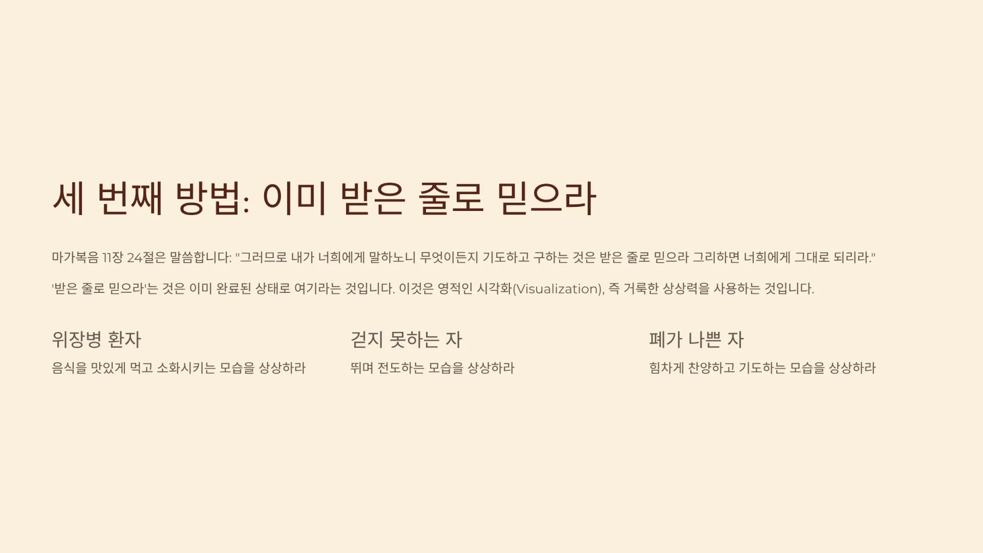 24절은 세 번째 방법을 제시한다. “그러므로 내가 너희에게 말하노니 무엇이든지 기도하고 구하는 것은 받은 줄로 믿으라 그리하면 너희에게 그대로 되리라.” 그렇다. 세 번째 방법은 ‘받은 줄로 믿는 것’, 즉 ‘이미 이루어진 상태를 상상(바라봄)하는 것’이다. ‘받은 줄로 믿으라’는 것은 과거형이 아니라, 이미 완료된 상태로 여기라는 것이다. 이것은 영적인 시각화(Visualization), 즉 거룩한 상상력을 사용하는 것이다.