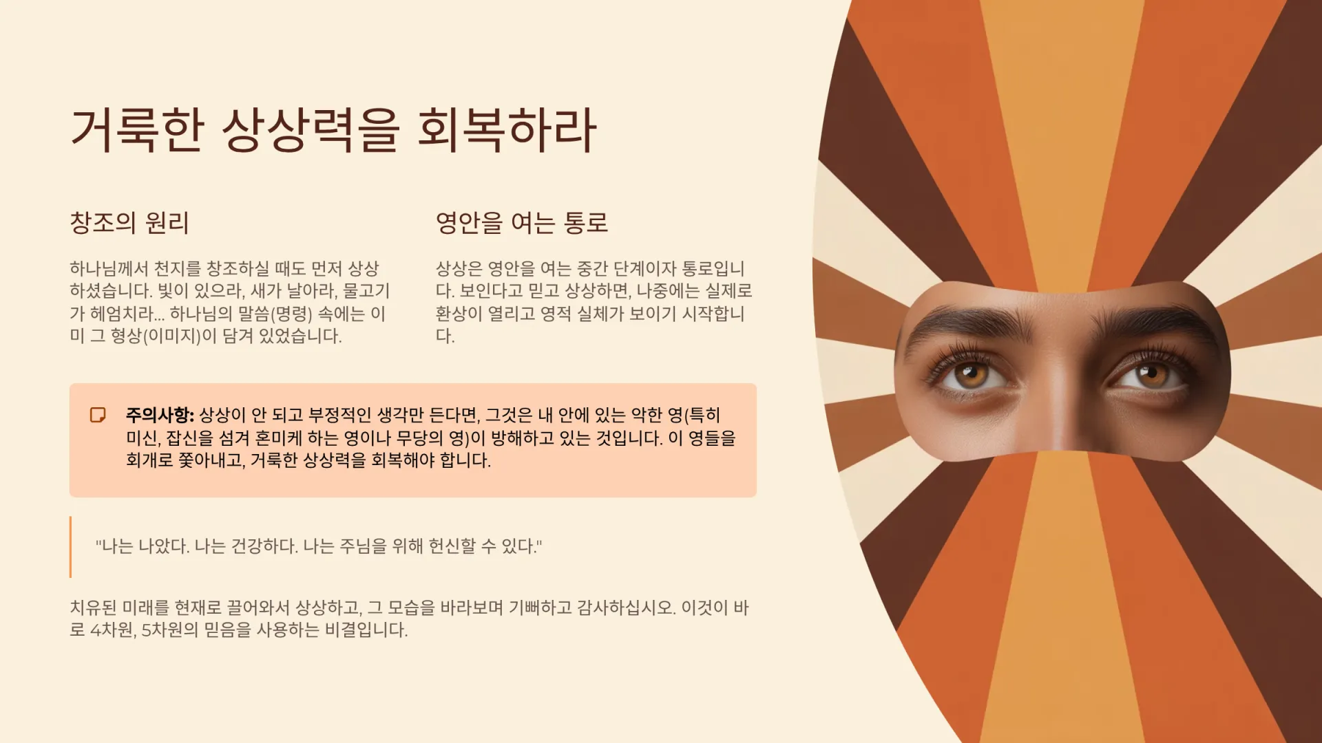그렇다. 필자는 영안이 열리기 전, 아무것도 보이지 않을 때가 있었다. 그러나 그때 ‘상상’하는 훈련을 했다. 스승의 조언대로 보인다고 믿고 상상했더니, 나중에는 실제로 환상이 열리고 영적 실체(뱀, 귀신 등)가 보이기 시작했다. 상상은 영안을 여는 중간 단계이자 통로이다. 반대로 상상이 안 되고 부정적인 생각만 든다면, 그것은 내 안에 있는 악한 영(특히 미신, 잡신을 섬겨 혼미케 하는 영이나 무당의 영)이 방해하고 있는 것이다. (필자의 어머니가 어릴 때 미신적 요법(잔밥을 먹인다?)으로 내 머리에 귀신을 심어놓았던 것처럼, 우리도 모르게 들어온 영들이 영적 상상력을 막고 있다.) 이 영들을 회개로 쫓아내고, 거룩한 상상력을 회복해야 한다.