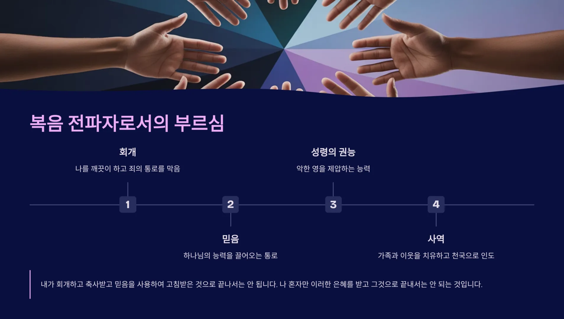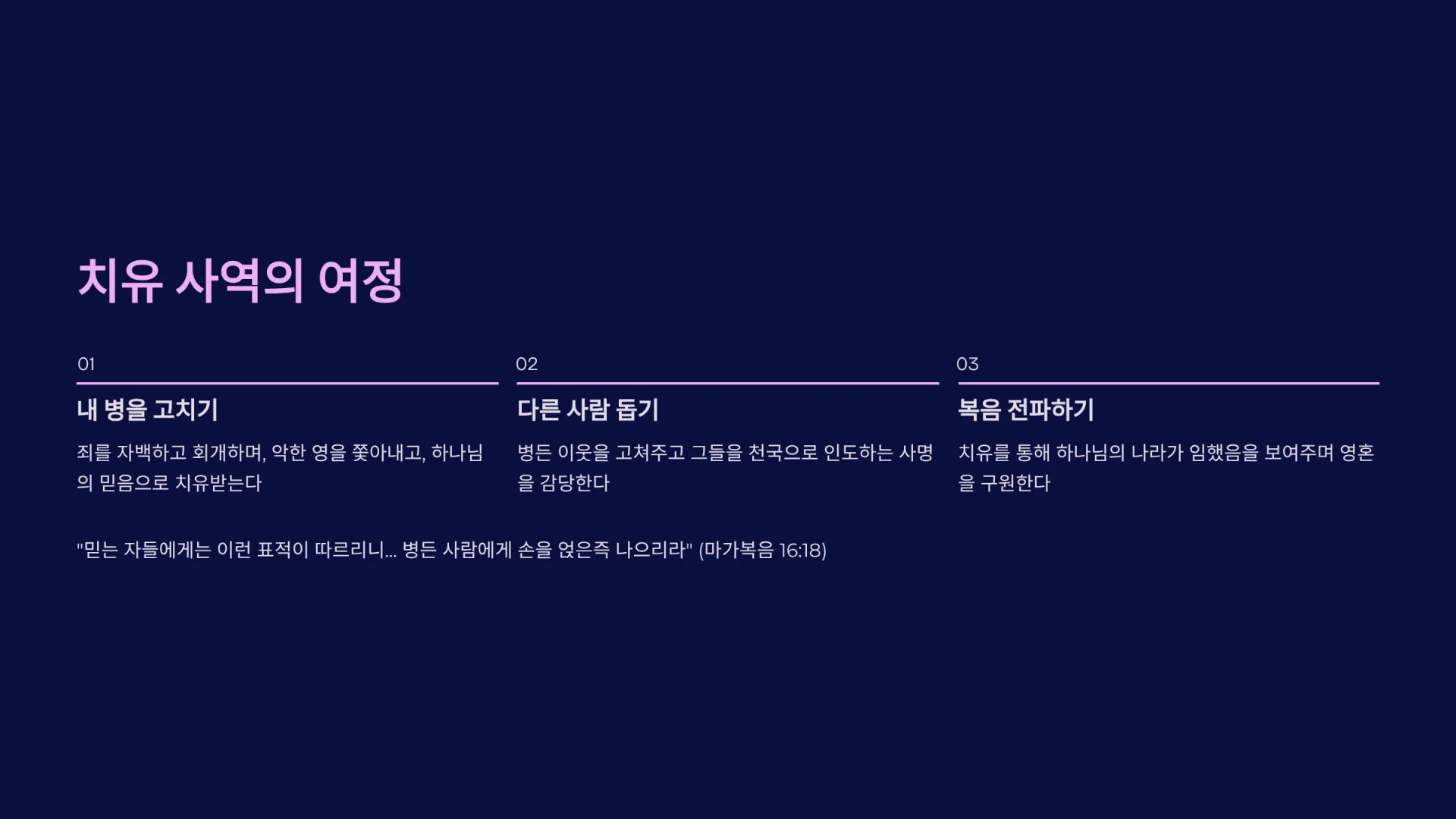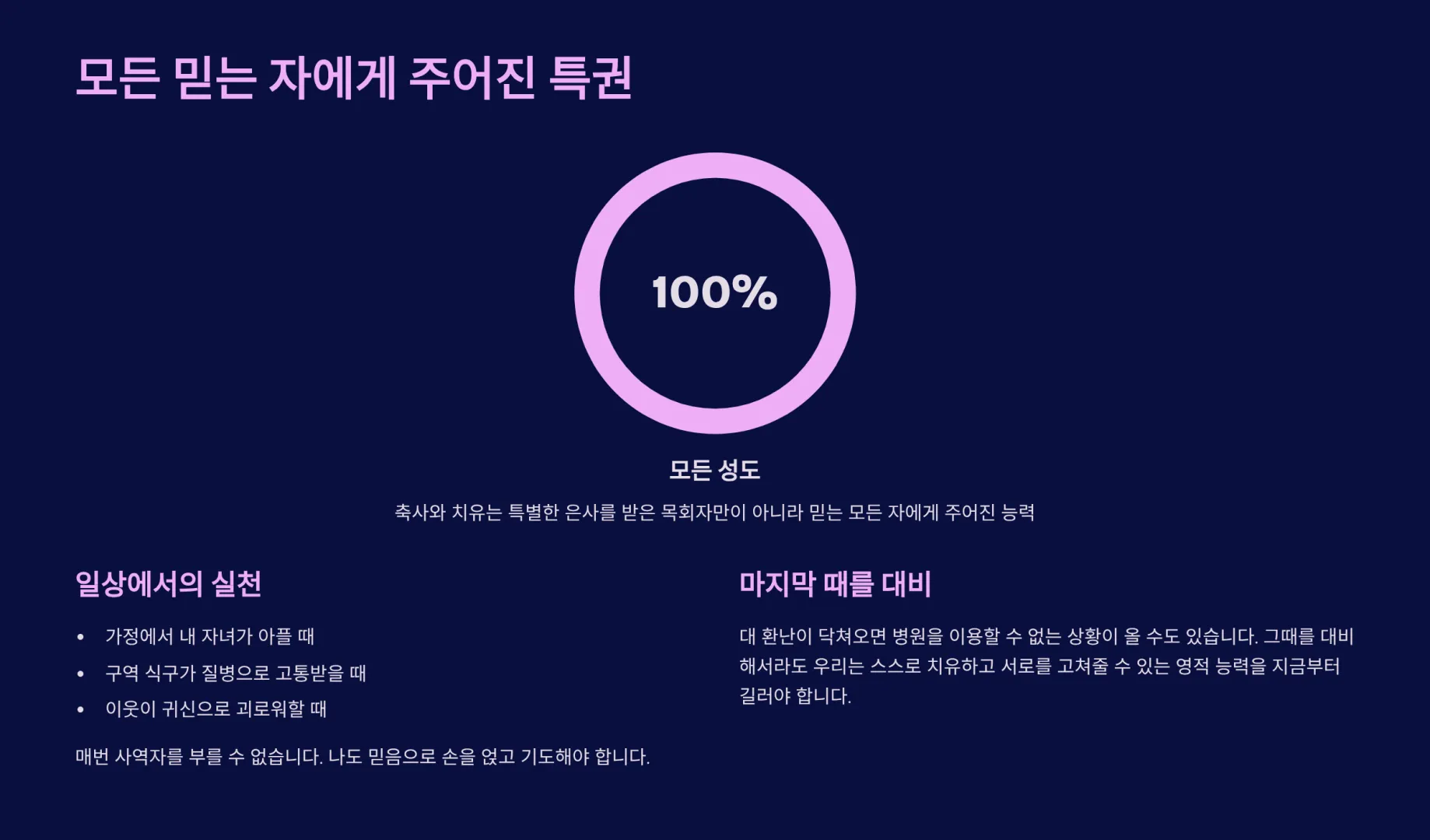 그러나 이제부터는 내가 내 병을 고치는 것을 넘어, ‘다른 사람의 병을 고쳐주는 치유 사역자’가 되려면 무엇을 준비해야 하는지를 다루고자 한다. 예수님께서는 승천하시기 전, 모든 믿는 자들에게 “병든 사람에게 손을 얹은즉 나으리라”(막 16:18)고 말씀하시며 치유 사역의 길을 열어주셨다. 내 병만 고치는 것으로 끝나는 것이 아니라, 병든 이웃을 고쳐주고 그들을 천국으로 인도하는 것은 모든 성도의 사명이다.