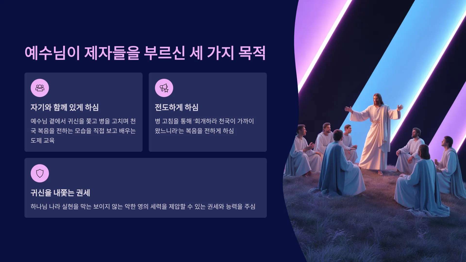 예수께서는 열두 제자를 부르실 때 분명한 목적을 가지고 계셨다. 그것은 3가지다.