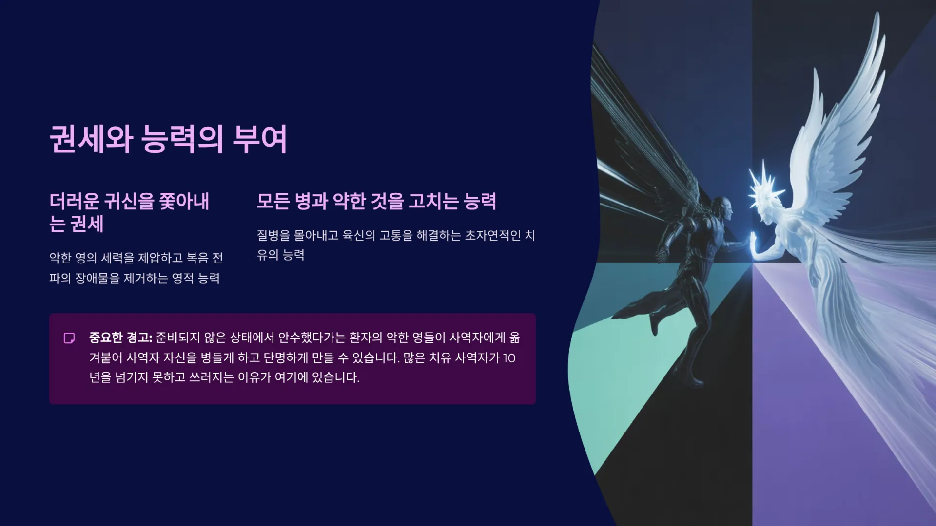 이에 마태복음 10장 1절에서는 “예수께서 그의 열두 제자를 부르사 더러운 귀신을 쫓아내는 권세와 모든 병과 모든 약한 것을 고치는 권능(능력)을 주시니라”고 기록하고 있다. 즉 치유 사역자는 단순히 의술이나 상담해주는 자가 아니라, 예수님께로부터 귀신을 제압하고 질병을 몰아내는 영적 능력을 부여받은 자인 것이다. 이러한  능력 없이 사역 현장에 뛰어드는 것은 위험하다. 준비되지 않은 상태에서 안수했다가는 환자의 악한 영들이 사역자에게 옮겨붙어 사역자 자신을 병들게 하고 단명하게 만들 수 있다. (실제로 많은 치유 사역자가 10년을 넘기지 못하고 쓰러지는 이유가 여기에 있다.)