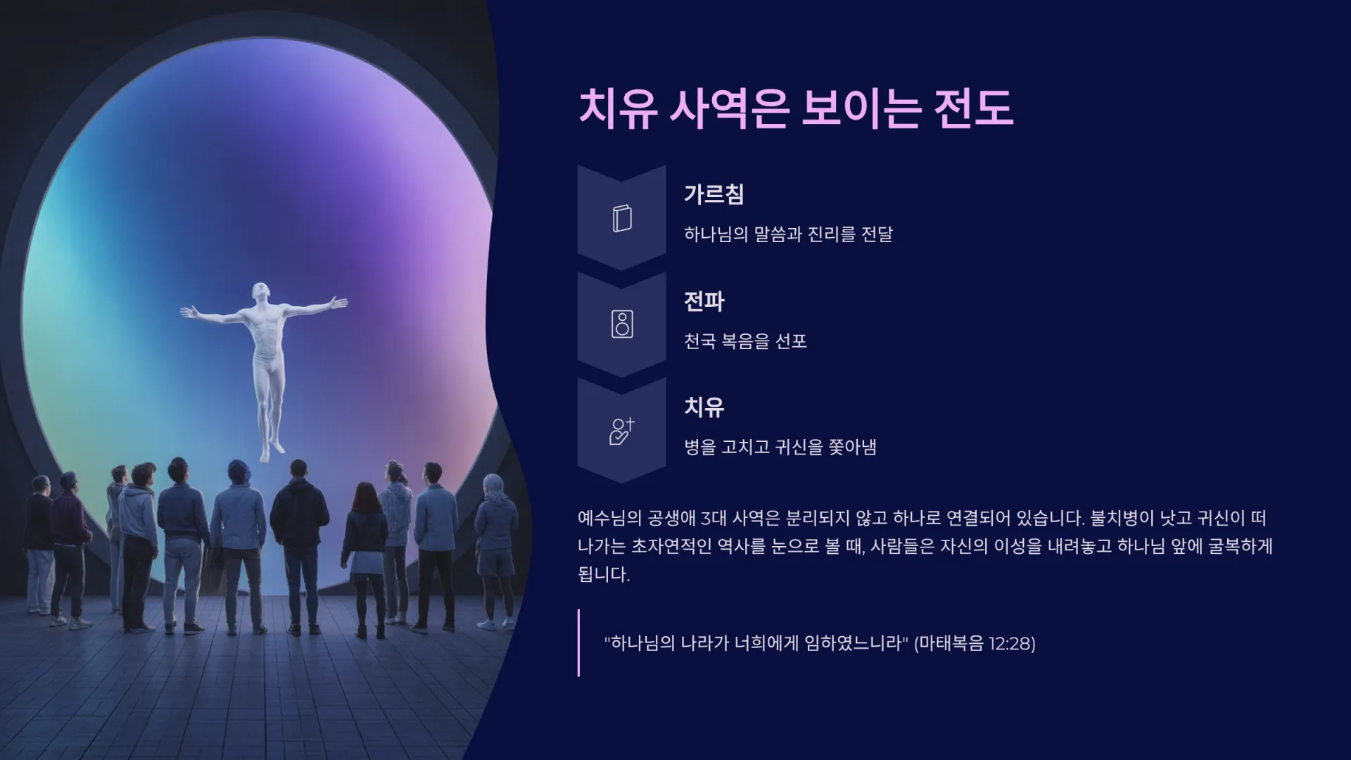예수께서 이 세상에서 공생애를 사시면서 행하신 3대 사역은 무엇인가? 그것은 가르치시고(Teaching), 전파하시고(Preaching), 고치시는(Healing) 사역이었다. 그런데 이 세 가지 사역은 분리되어 있는 것이 아니라 하나로 연결되어 있다. 예수님은 병을 고치고 귀신을 쫓아내심으로써, 눈에 보이지 않는 ‘하나님의 나라(통치)’가 이 땅에 실제로 임했다는 것을 보여주셨기 때문이다(마 12:28).