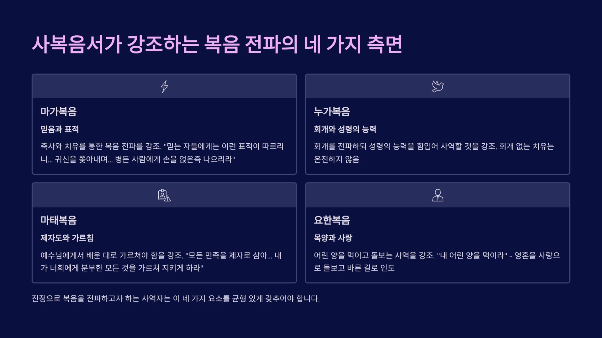 그러므로 예수님의 행적을 기록하고 있는 사복음서는 예수께서 행하신 복음전파사역을 이제 12제자들에게 부탁하시고 이어서 모든 믿는 이들에게 확대하였다. 그러나 사복음서가 말하는 강조점은 약간 다르다. 그러나 어느 것 하나라고 놓쳐서는 아니 된다. 그런데 오늘날 복음전파 사역을 하면서 수많은 그리스도인들은 이 4가지 측면 중에서 하나나 둘을 놓치고 전하고 있다. 그러므로 복음전파에 반쪽짜리 복음전파에 그치고 있는 것이다. 그렇다면 사복음서는 복음전파에 있어서 무엇을 강조하고 있으며, 그중에서도 치유 사역의 어떤 측면을 강조하고 있는가?