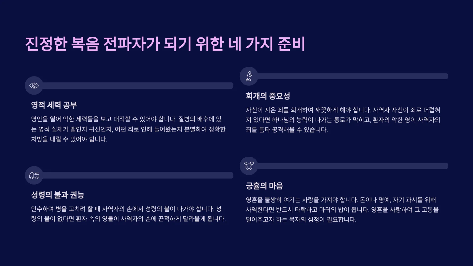 그러므로 누군가가 이제 구원을 받았으면 그때부터는 나 자신도 복음을 전파하고 가르치고 목양을 하는 일을 시작해야 한다. 이때에 우리가 반드시 해야 할 일이 있다면 그것은 무엇인가? 즉 이제 나도 구원받아서 남을 돕는 사역자가 되기를 원한다면 내가 진짜 준비해야할 중요한 요소는 무엇인가? 그것은 축사와 치유사역을 행하기 위한 준비다. 왜냐하면 회개하라고 하면서 복음을 전파할 때, 잠자는 영혼을 깨워 천국을 준비하게 도와주려면, 우리는  반드시 보이지 않는 영적 세력인 귀신들과 싸움 그리고 귀신들의 공격에 의해 고통받고 있는 이들을 치료해야 하기 때문이다. 그러므로 내가 진정한 복음전파자가 되기 위해서는 우리는 최소 다음과 같은 4가지를 갖추어야 한다.