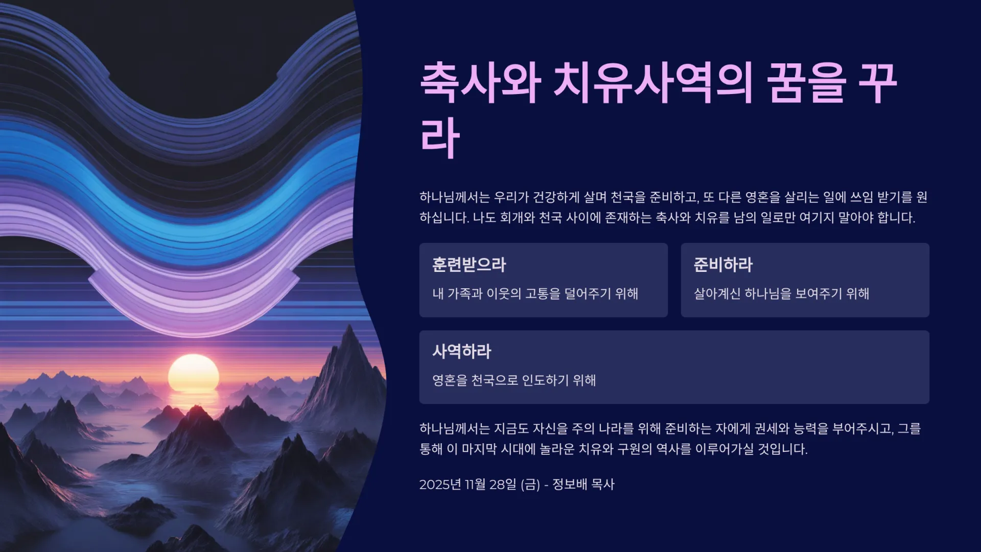 그래서 이 시간에는 예수님께서 제자들을 부르시고 파송하시며 명령하신 치유 사역의 본질을 살펴보고, 우리가 이 사명을 감당하기 위해 갖추어야 할 영적 준비는 무엇인지 깊이 있게 나누고자 한다.