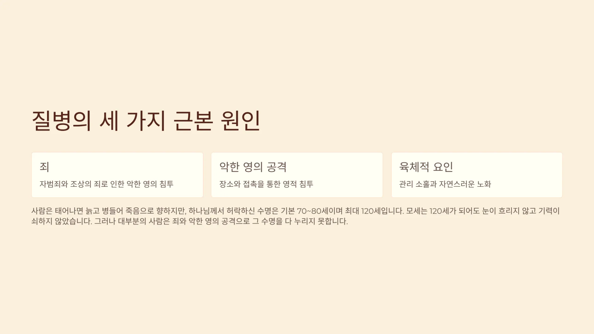 사람은 누구나 태어나면 늙고 병들어 죽음으로 향한다. 기계도 오래 쓰면 낡고 고장 나듯이, 우리 육체도 세월이 흐르면 노쇠해지고 기능이 약해진다. 이것은 자연스러운 이치다. 그러나 하나님께서 우리에게 허락하신 수명은 기본이 70~80세이며(시 90:10), 많으면 120세다(창 6:3). 모세는 120세가 되었어도 눈이 흐리지 않고 기력이 쇠하지 않았다. 우리 또한 그렇게 살 수 있다. 하지만 대부분의 사람은 죄와 악한 영의 공격으로 인해 그 수명을 다 누리지 못하고 각종 질병에 시달리다가 고통 속에 생을 마감한다.