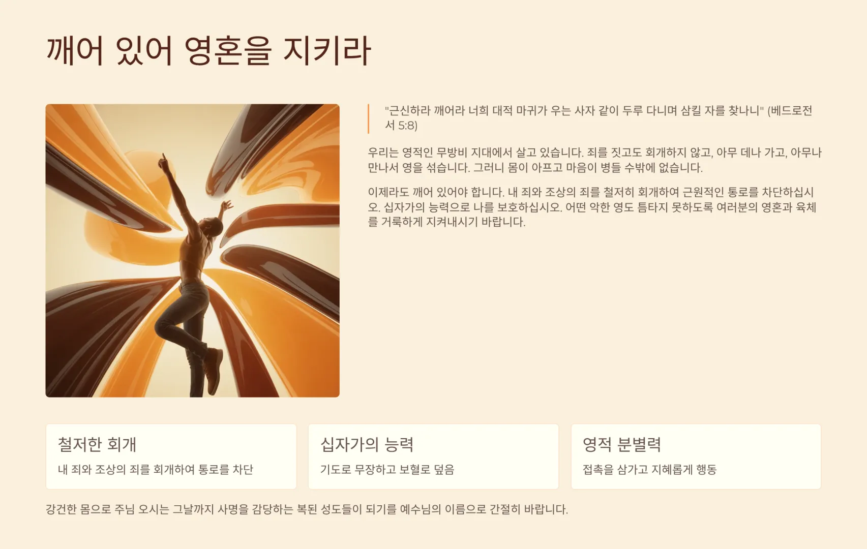 셋째, 가장 중요한 것은 '철저한 회개'다. 내 속에 악한 영이 없으면, 밖에서 아무리 유혹해도 들어오지 못한다. 내 안에 '유유상종(類類相從)'할 건덕지가 없기 때문이다. 내 안에 욕심이 있으니 탐욕의 영이 들어오고, 내 안에 미움이 있으니 살인의 영이 들어오는 것이다. 날마다 회개하여 내 속을 깨끗하게 청소하면, 악한 영들은 발붙일 곳이 없어 떠나간다.