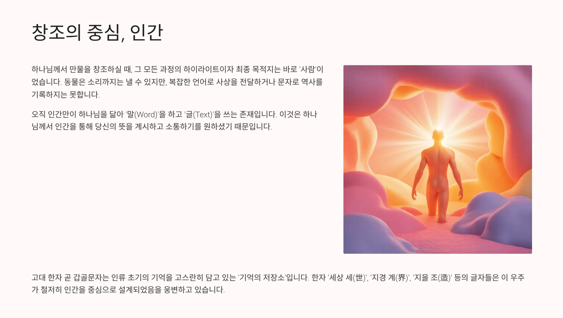 특히 창세기 1장과 2장의 창조 기사를 한자로 풀어보면, 놀라운 사실이 드러난다. 하나님이 우주를 지으신 목적은 지구를 위함이고, 지구를 지으신 목적은 에덴동산을 위함이며, 에덴동산을 지으신 목적은 그곳에 '사람'을 두기 위함이었기 때문이다. 즉, 천지창조의 모든 초점은 인간에게 맞춰져 있었던 것이다. 한자 '세상 세(世)', '지경 계(界)', '지을 조(造)' 등의 글자들은 이 우주가 철저히 인간을 중심으로 설계되었음을 웅변하고 있다. 그래서 이번 시간에는 한자라는 렌즈를 통해 인간 창조의 비밀과 우리가 받아야 할 참된 복의 실체를 파헤쳐 보고자 한다.