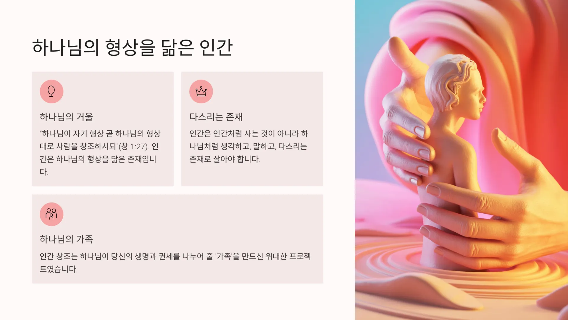 따라서 우리는 하나님을 막연한 기운이나 추상적인 개념으로 생각해서는 안 된다. 하나님은 인격적이시며, 우리가 그분을 닮은 것처럼 그분 또한 우리와 교감할 수 있는 형상을 가지신 분이신 것이다. 인간에게 '손'을 주신 것은 창조의 능력을, '입'을 주신 것은 말씀의 권세를 공유하기 위함이었던 것이다. 그러므로 인간 창조는 하나님이 당신의 '거울'을 만드신 사건이며, 당신의 생명과 권세를 나누어 줄 '가족'을 만드신 위대한 프로젝트였음을 알 수 있다.