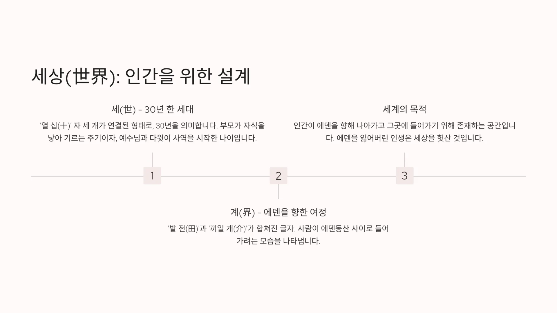 고로 세상(世界)은 인간이 먹고 마시고 즐기다가 끝나는 곳이 아니다. 인간(世)이 에덴(界, 田)을 향해 나아가고 그곳에 들어가기 위해 존재하는 공간이다. 따라서 에덴(천국)을 잃어버린 인생은 세상을 헛산 것이다. 우리의 목적지는 밭(田)이다. 그곳에 들어가 생명나무의 실과를 먹는 것, 이것이 창조의 목적이다.