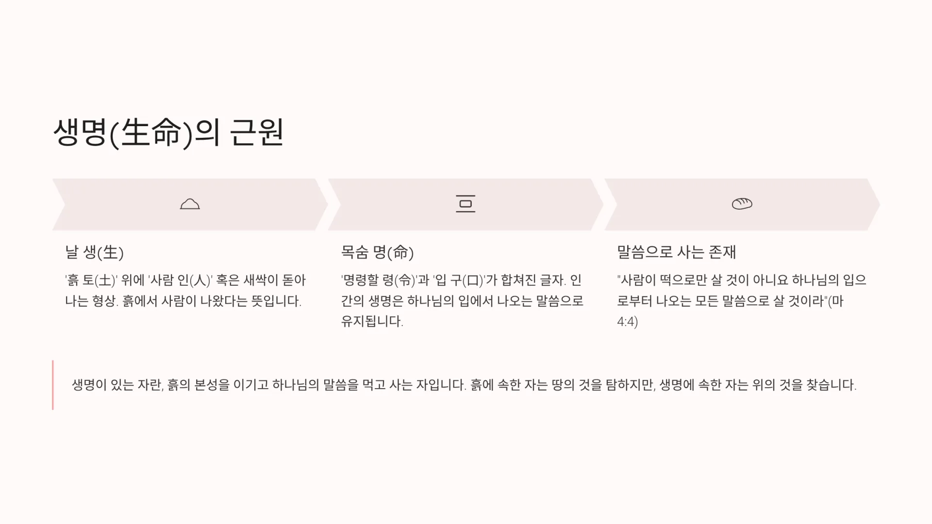 '생(生)' 자는 우리의 육체적 기원이 흙임을 보여주지만, '명(命)' 자는 우리의 영적 기원이 하나님의 말씀임을 보여준다. 따라서 생명이 있는 자란, 흙의 본성을 이기고 하나님의 말씀을 먹고 사는 자다. 흙에 속한 자는 땅의 것을 탐하지만, 생명에 속한 자는 위의 것을 찾는다.