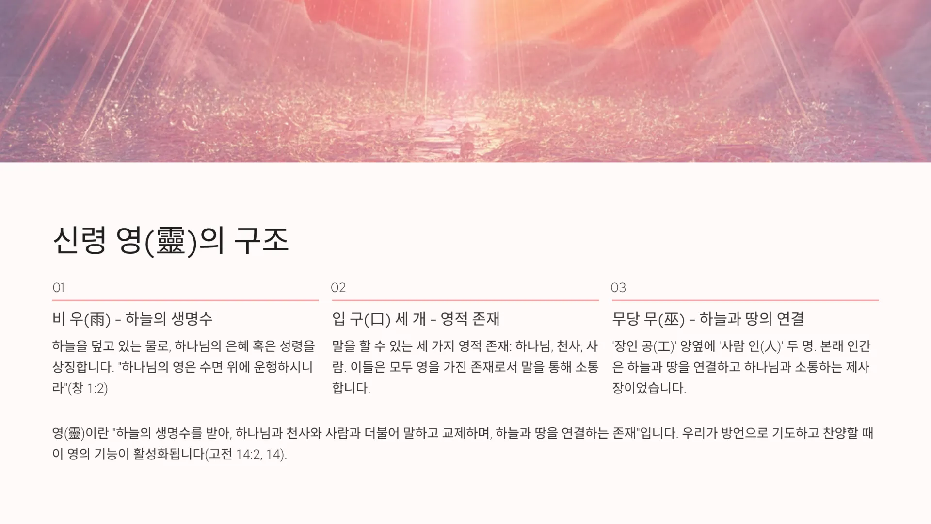 종합하면, '영(靈)'이란 "하늘의 생명수(雨)를 받아, 하나님과 천사와 사람과 더불어 말(口)하고 교제하며, 하늘과 땅을 연결하는(巫) 존재"라는 뜻이다. 이것에 '하나님' 붙어 있으면 '하나님의 영' 곧 성령을 가리킨다. 그러나 이것은 사람의 영이 어떤 것인지도 동시에 알려준다. 사람의 영은 하나님의 생명을 받아 거듭나 하나님의 자녀가 되어야 하며, 하나님과 땅을 연결하는 존재였던 것이다. 그러면 사람의 영은 어떻게 알 수 있고 느낄 수 있는가? 극서은 우리가 방언으로 기도하고 찬양할 때다. 왜냐하면 그때에 이 '영'의 기능이 활성화되기 때문이다(고전 14:2, 14).