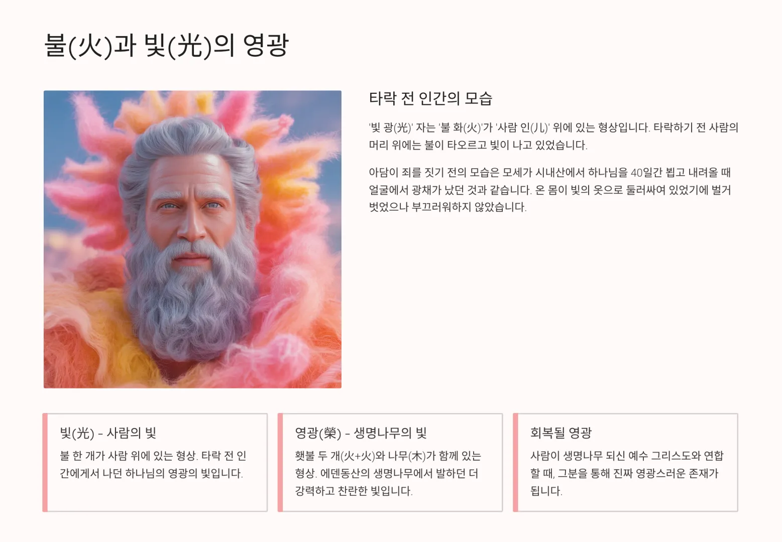 하나님께서 아담(사람)을 처음 창조하셨을 때, 그때의 모습은 어떠했을까? 아직 타락하기 전의 인간은 어떤 모습을 지녔을까? 그것은 한자 '빛 광(光)' 자가 그 단서를 우리에게 제공해준다. 이 글자는 '불 화(火)' 자가 '사람 인(儿)' 위에 있는 형상이다. 즉, 타락하기 전의 사람의 머리 위에는 불이 타오르고 있었고 빛이 나고 있었던 것이다.
