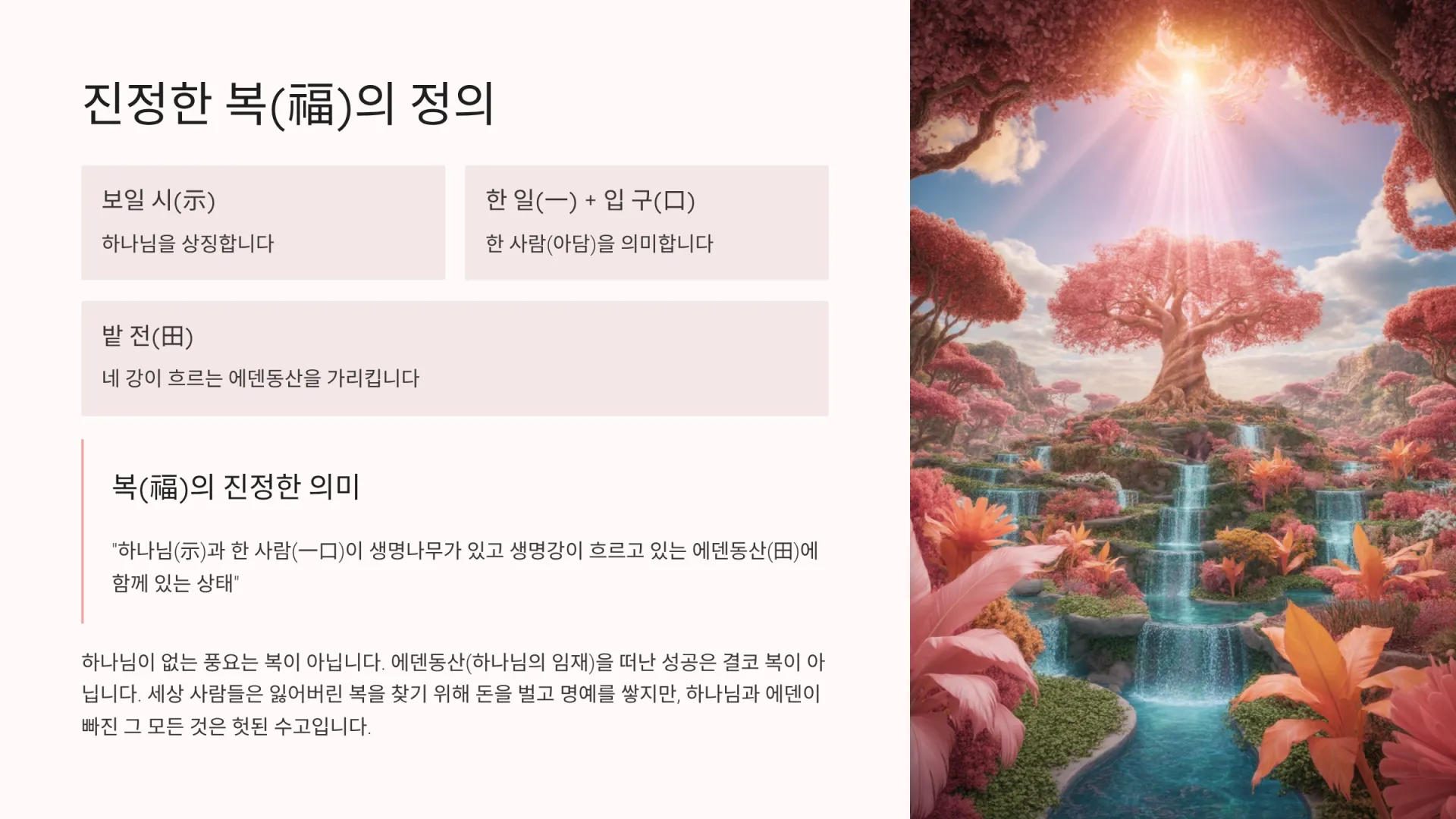 이것들을 조합하면 복의 정의는 명확해진다. "하나님(示)과 한 사람(一口)이 생명나무가 있고 생명강이 흐르고 있는 에덴동산(田)에 함께 있는 상태." 이것이 바로 복이다. 하나님이 없는 풍요는 복이 아니다. 에덴동산(하나님의 임재)을 떠난 성공은 결코 복이 아니다. 아담이 타락하여 에덴에서 쫓겨난 순간, 인간은 그 복을 상실했다. 그래서 세상 사람들은 잃어버린 복을 찾기 위해 돈을 벌고 명예를 쌓지만, 하나님과 에덴이 빠진 그 모든 것은 헛된 수고가 되는 것이다.