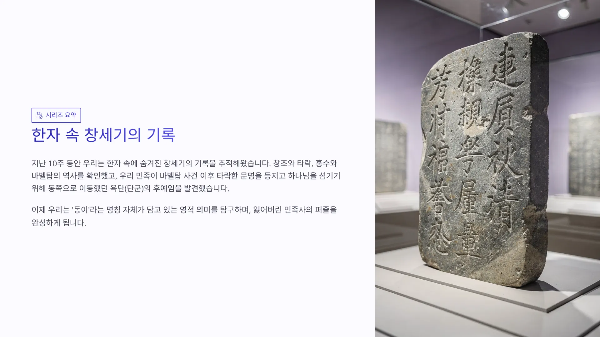 우리는 지난 시간까지 총 10주에 걸쳐 한자 속에 숨겨진 창세기의 기록, 즉 창조와 타락, 홍수와 바벨탑의 역사를 추적해 왔다. 그 과정에서 우리는 우리 민족이 바벨탑 사건 이쪽저쪽으로 타락한 문명을 등지고 하나님을 섬기기 위해 동쪽으로 이동했던 욕단(단군)의 후예임을 확인했다.