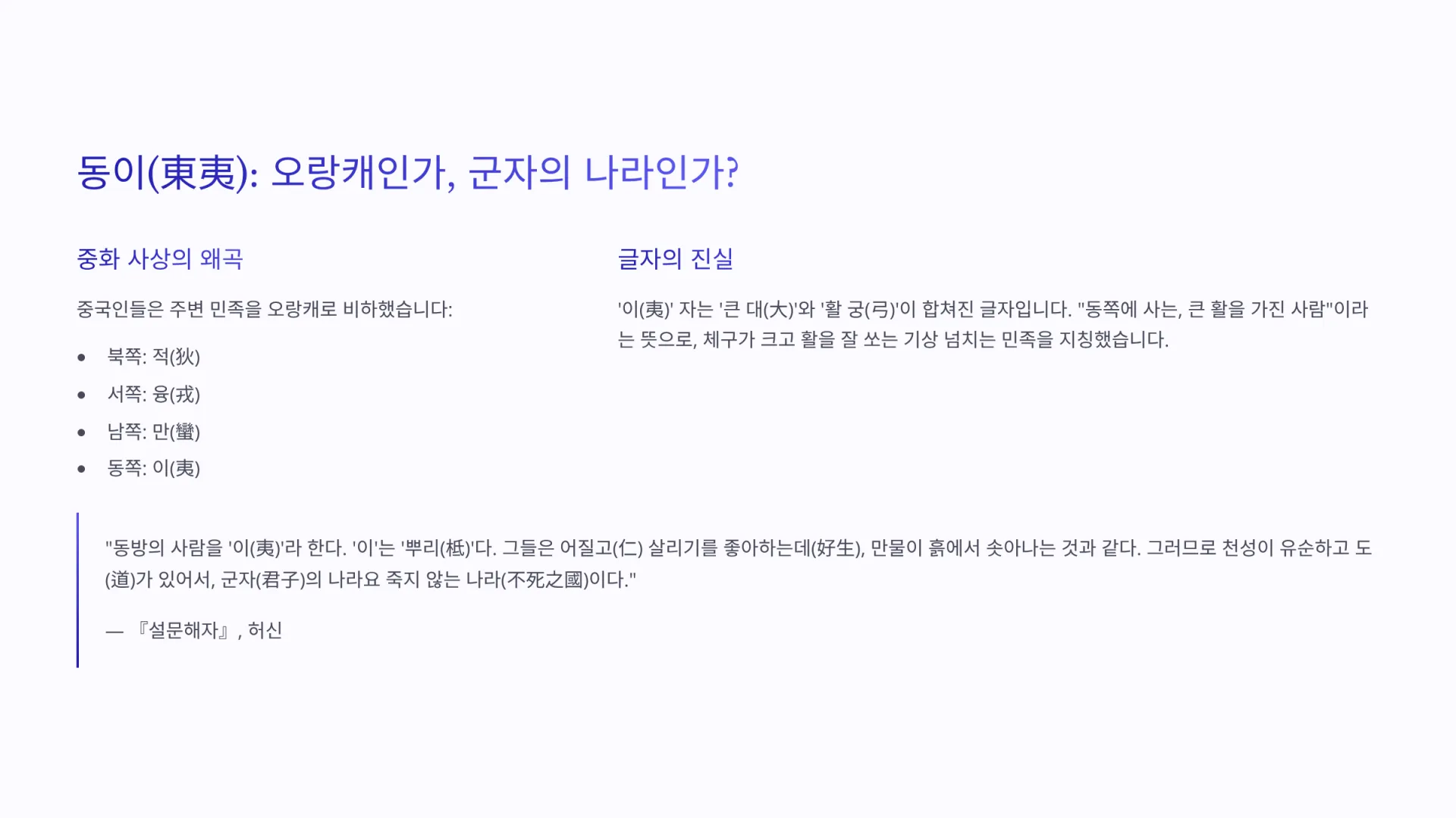 '동이(東夷)'의 한자 구조(大+弓)를 분석하여 '큰 활을 가진 사람'을 의미하는 민족 정체성을 설명합니다.