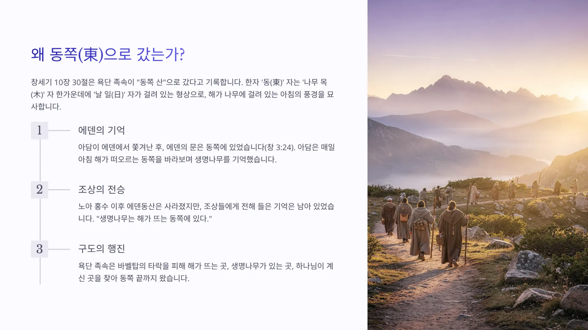 그렇다면 욕단족은 왜 하필 서쪽 평야를 버리고 험한 산악 지대인 '동쪽(東)'으로 갔을까? 창세기 10장 30절은 욕단 족속이 "동쪽 산"으로 갔다고 기록한다. 한자 '동(東)' 자를 보자. 이 글자는 '나무 목(木)' 자 한가운데에 '날 일(日)' 자가 걸려 있는 형상이다. 해가 나무에 걸려 있다. 이것은 해가 뜨는 아침의 풍경을 묘사한 것이다.