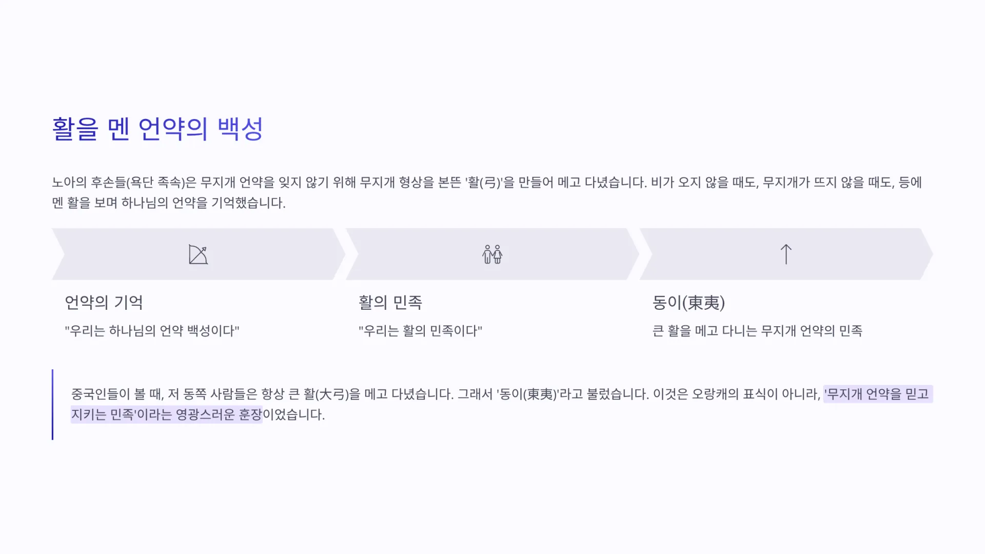 이제 이것이 가장 중요한 질문이다. 왜 우리 민족을 상징하는 '이(夷)'라는  글자에 '활 궁(弓)' 자가 들어갔는가? 단순히 사냥을 잘해서인가? 싸움을 잘해서인가? 아니다. 여기에는 노아 홍수 이후 하나님이 주신 언약의 비밀이 숨어 있다.