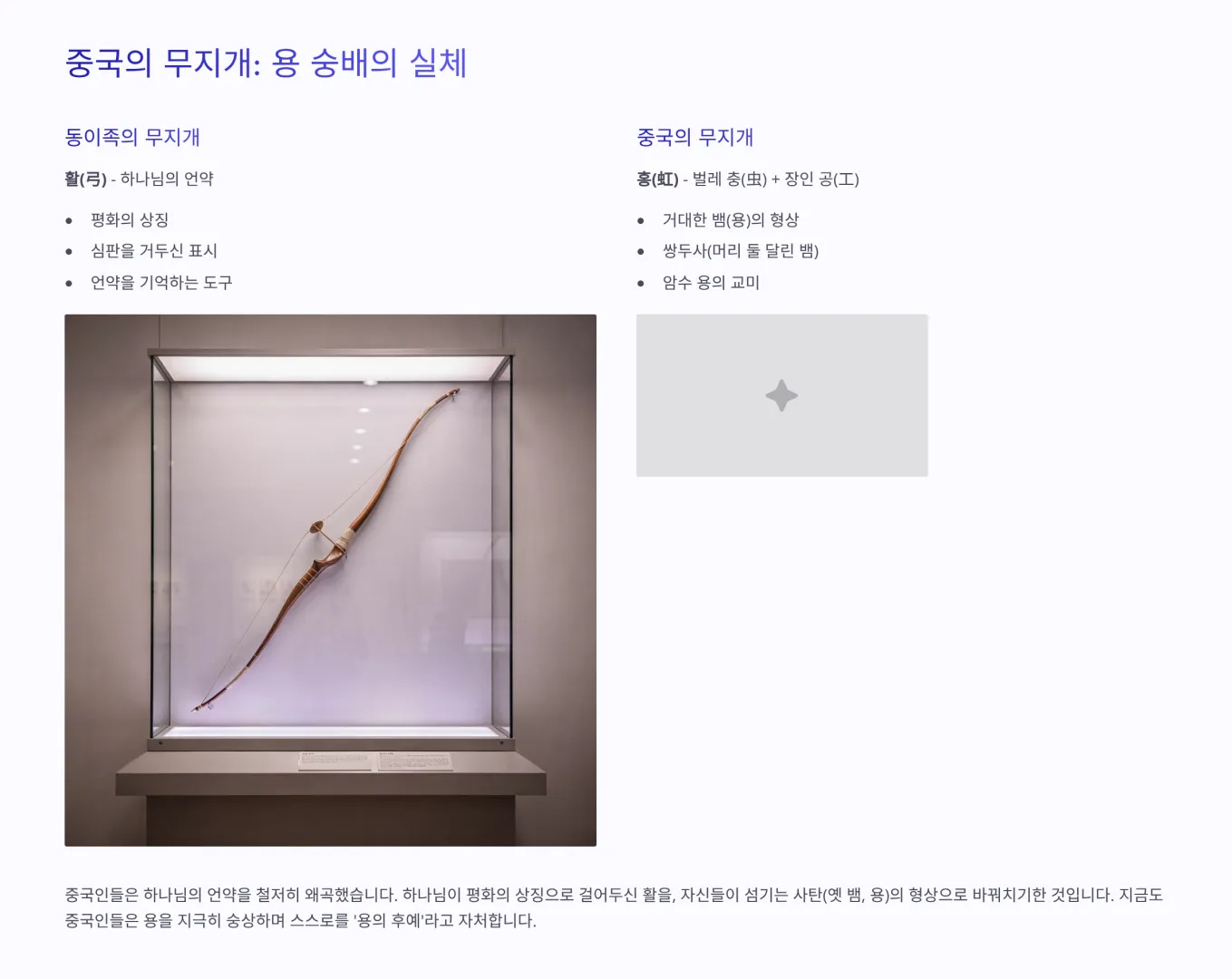하나님은 무지개를 분명 하늘에 걸어둔 '활(Bow)'이라고 하셨고, 동이족은 그 언약을 기억하여 '활(弓)'을 민족의 상징으로 삼았다. 그런데 서쪽의 바벨탑 무리, 즉 함족의 후예인 중국(지나족)은 무지개를 전혀 다르게 해석했다. 그들의 무지개를 '무지개 홍(虹)' 자를 표현했다.