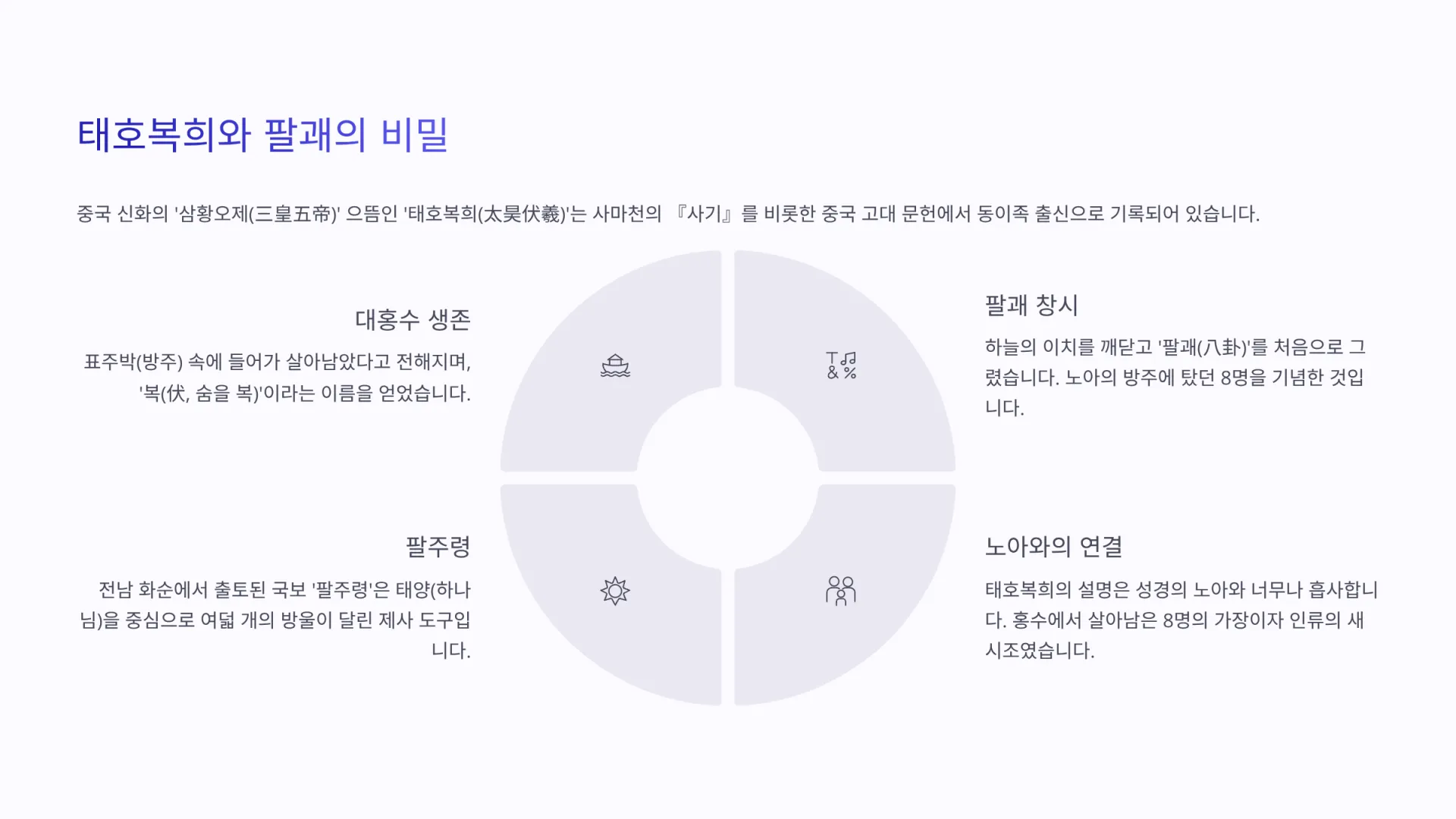 그렇다면 태호복희가 그렸다는 '팔괘'는 대체 무엇을 가리키는가? 주역의 기초가 되는 이 팔괘는 건(하늘), 곤(땅), 감(물), 리(불) 등 우주의 원리를 8가지로 설명한다. 우리 태극기 모서리에 있는 4괘가 바로 여기서 나온 것이다. 그럼, 왜 하필 '8(Eight)'인가? 노아의 방주에 탔던 식구가 8명이었기 때문이다. 한자 '배 선(船)' 자에도 '여덟(八) 식구(口)'가 있었다고 나오듯이, 태호복희(노아로 추정)는 홍수 심판에서 살아남은 8명의 생존을 기념하고, 우주 만물의 질서를 설명하기 위해 팔괘를 만들었을 가능성이 매우 큰 것이다.