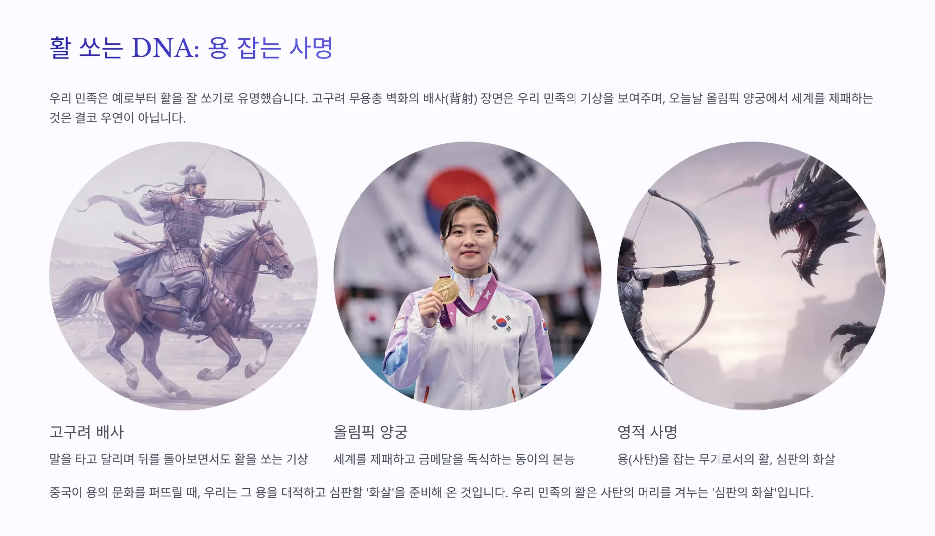 고구려 기마 궁술부터 현대 올림픽 양궁에 이르는 한국인의 활 유전자를 '활의 민족'의 사명과 연결합니다.