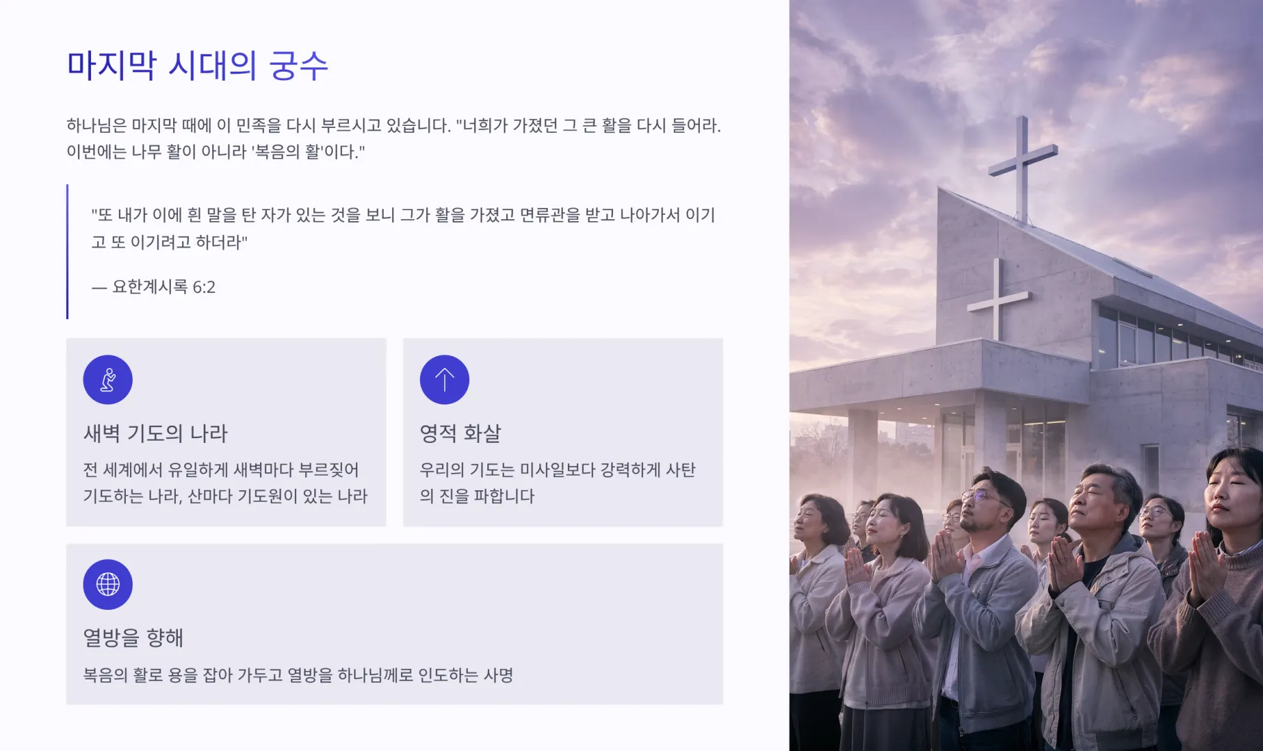 대한민국은 전 세계에서 유일하게 새벽마다 부르짖어 기도하는 나라다. 산마다 기도원이 있고, 통성 기도의 함성이 끊이지 않는 나라다. 이것이 바로 영적인 화살을 쏘아 올리는 것이다. 우리의 기도는 미사일보다 강력하게 사탄의 진을 파한다. 하나님은 이 민족을 '마지막 시대의 궁수(Archer)'로 쓰시기를 원하신다. 중국이 용(공산주의, 무신론, 물질만능)을 앞세워 세상을 어지럽힐 때, 우리는 복음의 활로 그 용을 잡아 가두고 열방을 하나님께로 인도해야 한다.
