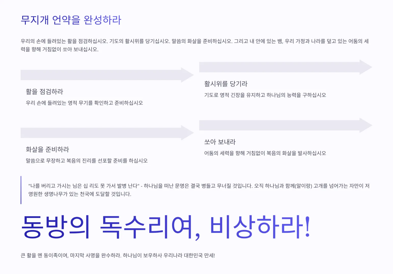 동방의 독수리여, 비상하라. 큰 활을 멘 동이족이여, 마지막 사명을 완수하라. 하나님이 보우하사 우리나라 대한민국 만세!