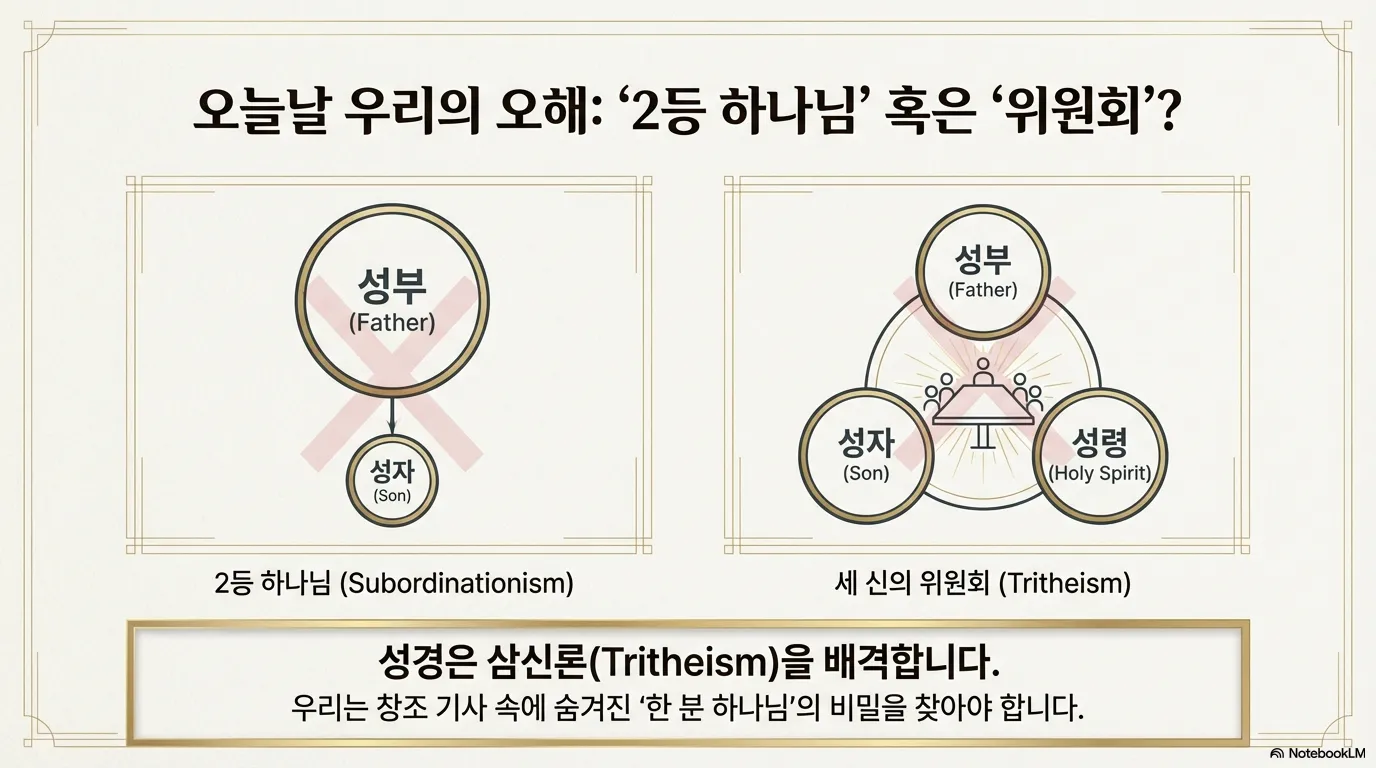 이제 창세기 1장으로 들어가 보자. "태초에 하나님이 천지를 창조하시니라." 여기서 하나님은 히브리어로 '엘로힘(복수형)'라는 명칭이 사용되고 있다. 그래서 어떤 이들은 "보라, '엘로힘'이 복수이지 않는가? 그러므로 천지창조는 성부와 성자와 성령께서 같이 망치 들고 천지를 만든 것이다"라고 주장한다. 그러나 과연 그럴까? 구약 성경은 창조의 주체에 대해 아주 단호하게 선을 긋고 있다.