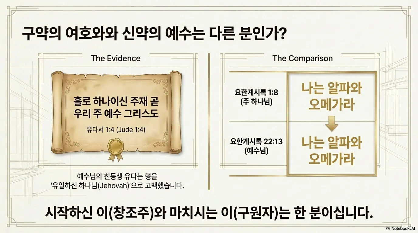 그랬다. 예수님의 친동생 유다는 예수님을 "홀로 하나이신 주재(Master)", "홀로 하나이신 하나님"이라고 고백하였다. 그런데 유대인에게 '홀로 한 분'은 대체 누구였는가? 그분은 오직 여호와 한 분뿐이시다(신6:4~9). 그런데 유다는 자신의 형 예수님을 바로 그 여호와 하나님으로 인식하게 된 것이다. 정리하자면 이런 것이다. 구약의 여호와는 '창조주 하나님'으로 나타나신 분이라면, 신약의 예수님은 '구원자 하나님'으로 나타나신 분이라는 것이다. 두 분이 따로 있는 것이 아니라, 한 분 하나님이 시대와 경륜에 따라 자신을 다르게 계시하셨다고 믿은 것이다.