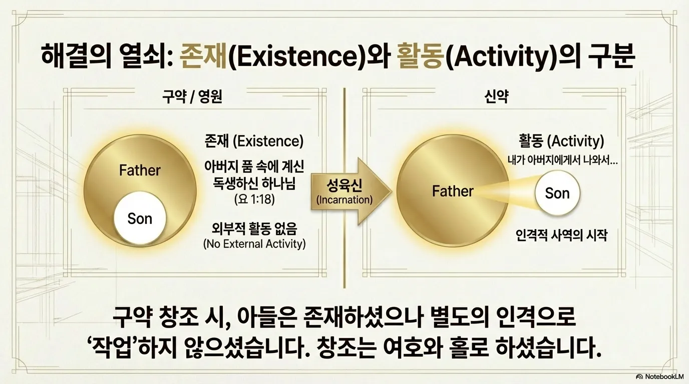 만약 예수님이 구약 시대에도 이미 아버지 밖으로 나와서 활동하고 계셨다면, 굳이 신약에 와서 "내가 아버지에게서 나왔다"고 말씀하실 이유가 없다. 내가 아버지와 함께 활동하다가 이제야 육신을 입었다고 말씀해야 한다. 그러므로 구약의 창조 기사에서 아들이 아버지 옆에서 망치를 들고 아버지와 함께 못질을 했다고 생각하는 것은 큰 무리적인 해석이다. 창조의 실행은 여호와 하나님이 홀로 하셨다. 이것은 부정할 수 없는 사실이다(사44:24). 그러나 단, 하나님 안에 '아들'이라는 영원한 계획과 목적, 그리고 지혜가 내재해 있었다. 아들은 아버지의 품 속에서 창조의 이유가 되셨고, 때가 차매 우리 눈에 보이는 육체를 입고 이 땅에 오시어 '활동'을 시작하신 것이다. 이것을 '하나님의 경륜(Economy of God)'적인 안배라고 말한다.