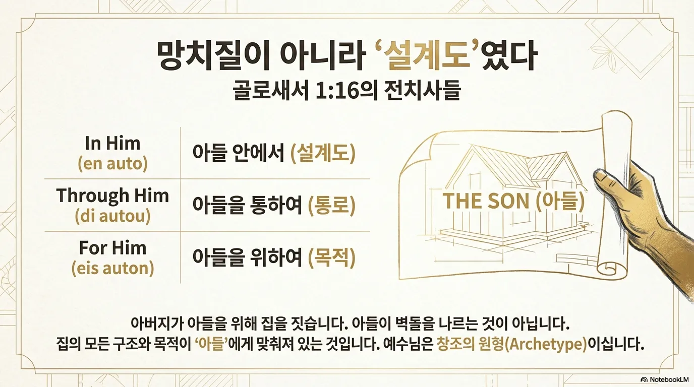 그렇다면, 도대체 구약의 증언이 맞는가 신약의 증언이 맞는가? 과연 예수님이 지으셨다는 말인가, 아니 지으셨다는 말인가? 이 비밀을 푸는 열쇠는 사실 헬라어 전치사에 있다. 헬라어 원문을 보면 만물이 아들에게서 직접 나온 것이 아니라, "아들 안에서(en auto)", "아들을 통하여(di autou)", "아들을 위하여(eis auton)" 창조되었다고 기록되어 있기 때문이다(골 1:16). 이것은 예수님이 작업복 입고 망치질을 했다는 뜻이 아니다. 하나님이 천지를 창조하실 때, '아들'을 창조의 목적과 설계도로 삼으셨다는 뜻이다.