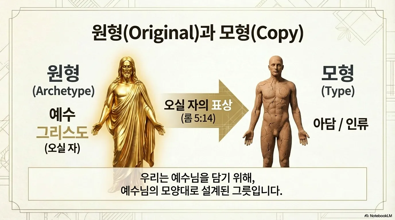 그러므로 하나님께서는 인간을 창조하실 때, 먼 훗날 아들이 입고 오실 그 육체의 모양을 염두에 두시고 인간을 빚으신 것이다. 즉, 아담이 원형이 아니라, 예수 그리스도가 원형(Original)이고 아담은 그것에 대한 모형(Copy)인 것이다. 그래서 로마서 5장 14절에서 사도 바울은 "아담은 오실 자의 모형(표상)"이라고 못 박고 있는 것이다.