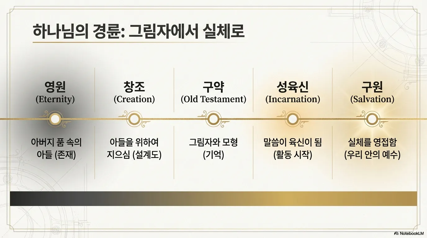 사실 하나님은 시간 밖 영원 속에 계신다. 그분은 창조를 시작하시기 전에 이미 장차 오실 아들(예수 그리스도)을 계획하셨다. 그리고 실제로 아버지의 품 속에 존재하고 있었다. 그리고 그 아들에게 만물을 '상속(Inheritance)'해 주시기 위해 한 분 하나님께서 우주를 설계하신 것이다. 마치 아버지가 장차 태어날 아들을 위해 집을 짓는 것과 같은 이치다. 집은 아버지가 짓지만, 그 집은 아들을 위한 것이고, 아들의 동선을 고려해서(아들 안에서) 지어지는 것이다.
