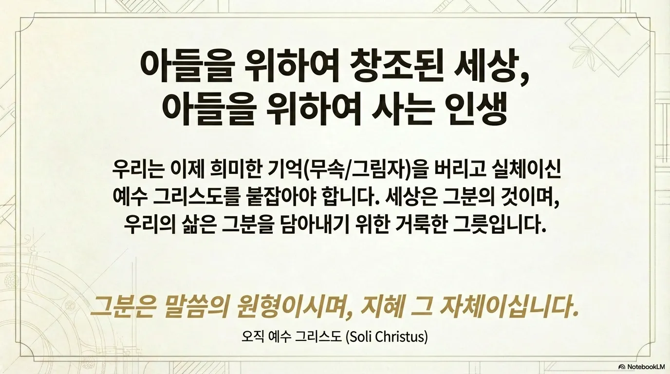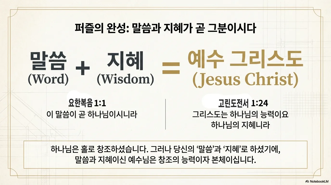 결국 퍼즐이 맞춰진다. 구약에서 여호와께서 말씀과 지혜로 세상을 지으셨다는 말은, 곧 예수 그리스도 안에서, 예수 그리스도를 통하여, 예수 그리스도를 위하여 세상을 지으셨다는 말과 정확히 일치한다. 다만 구약에서는 그것이 인격적인 '아들'로 표현하지 않고 하나님의 속성(말씀, 지혜)으로 표현하고 있을 뿐이다. 그렇다. 예수님께서 창조 때 없었던 분이 결코 아니다. 그분은 창조의 도구이자 능력이셨던 말씀 그 자체요, 지혜 그 자체로 함께 하고 계셨다. 그래서 요한복음 1장 3절에서도 "만물이 그(말씀)로 말미암아 지은 바 되었으니 지은 것이 하나도 그가 없이는 된 것이 없느니라"고 증언하고 있는 것이다.