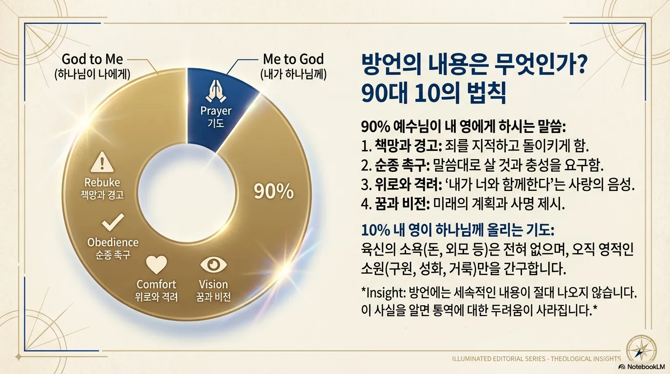 이것이 방언의 내용의 실체다. 여러분이 앞으로 방언 통역을 직접 해보면 알겠지만, 방언의 내용에는 육신적인 욕망이나 주식 투자 같은 세속적인 내용이 절대 나오지 않는다는 것이다. 오직 하나님의 뜻과 영적 성장을 위한 내용만 나올 뿐이다. 이것을 미리 알고 있으면 통역에 대한 두려움이 사라지고 분별하기가 훨씬 쉬워진다.