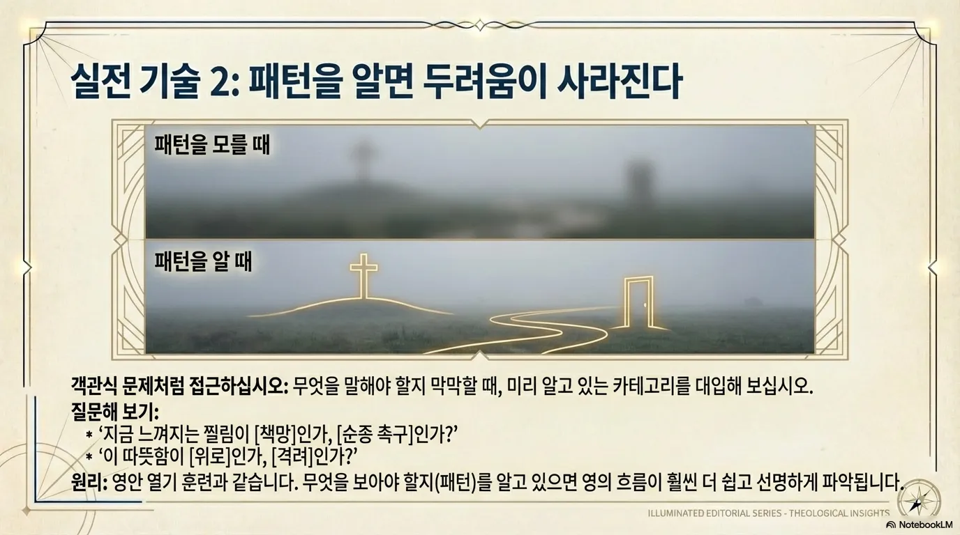 이것은 마치 영안 열기를 훈련할 때에 영으로 십자가를 보기를 하는 것과 비슷하다. 영안이 제대로 열리지 않는 사람에게 그냥 십자가를 보라고 말하면, 그것을 어떻게 보아야 하며 무엇이 보이는 것인지를 막막하여 답답하겠지만, 그것이 "나무 십자가인지, 스테인레스 십자가인지, 불이 들어와 있는 십자가인지, 그 크기가 얼마나 큰 십자가인지" 그 종류들을 알려주고 보라고 하면 훨씬 쉽게 형상을 볼 수 있는 것과 같다. 방언 통역도 이와 마찬가지다. 하나님이 주시는 메시지의 패턴을 알고 있으면, 막연한 두려움이 사라지고 영의 흐름을 파악하기가 수월해진다. 알면 보이기 시작하는 것이다. 그래서 보이면 말을 할 수가 있는 것이다.